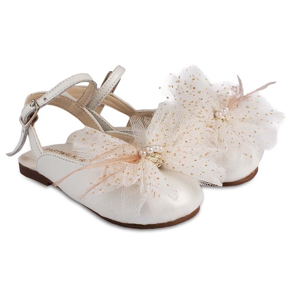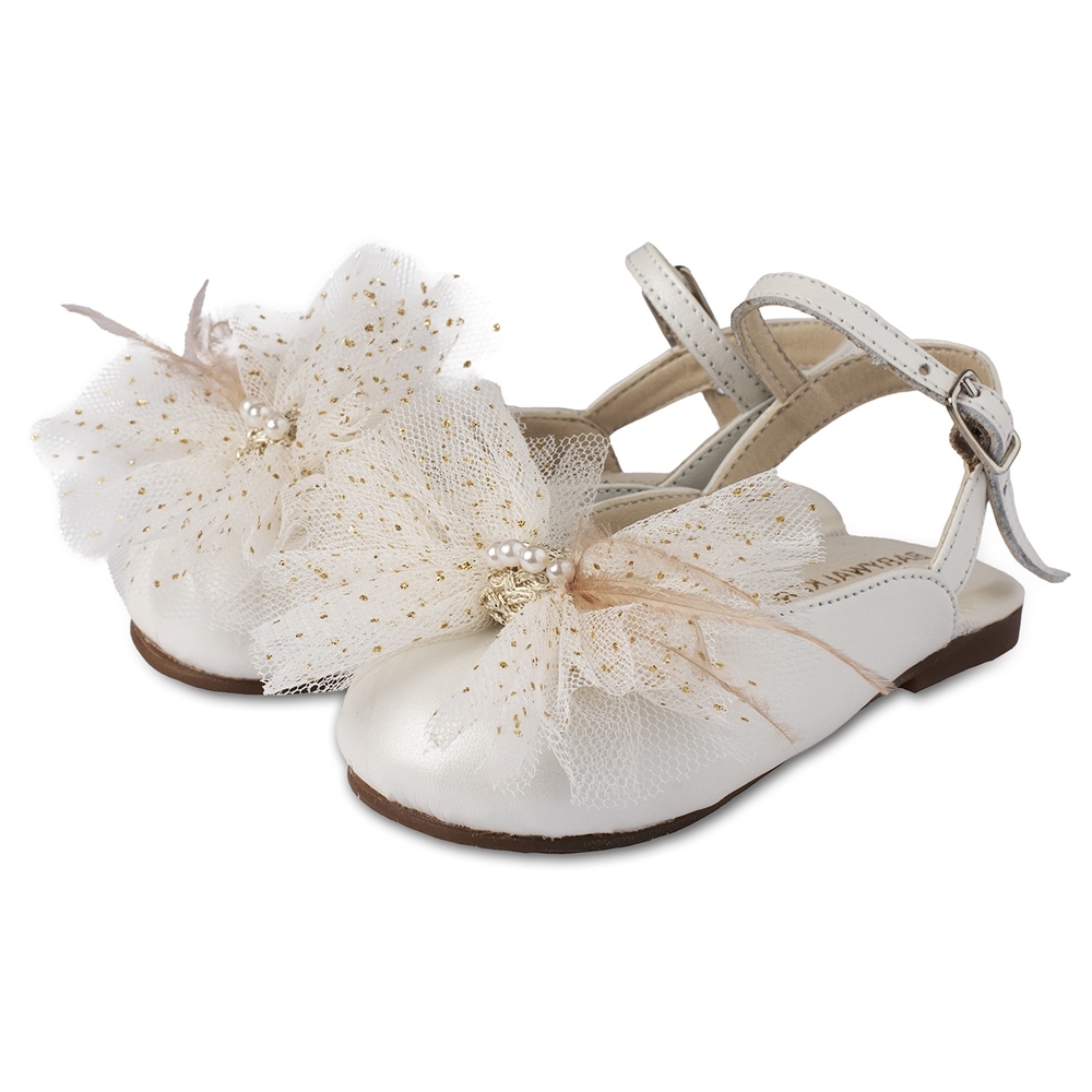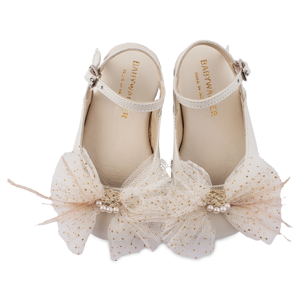 Δερμάτινο πέρλα σαμπό, διακοσμημένο με χειροποίητο φιόγκο από τούλι και πούπουλα, σε εκρού χρώμα. Παπουτσάκια περπατήματος.