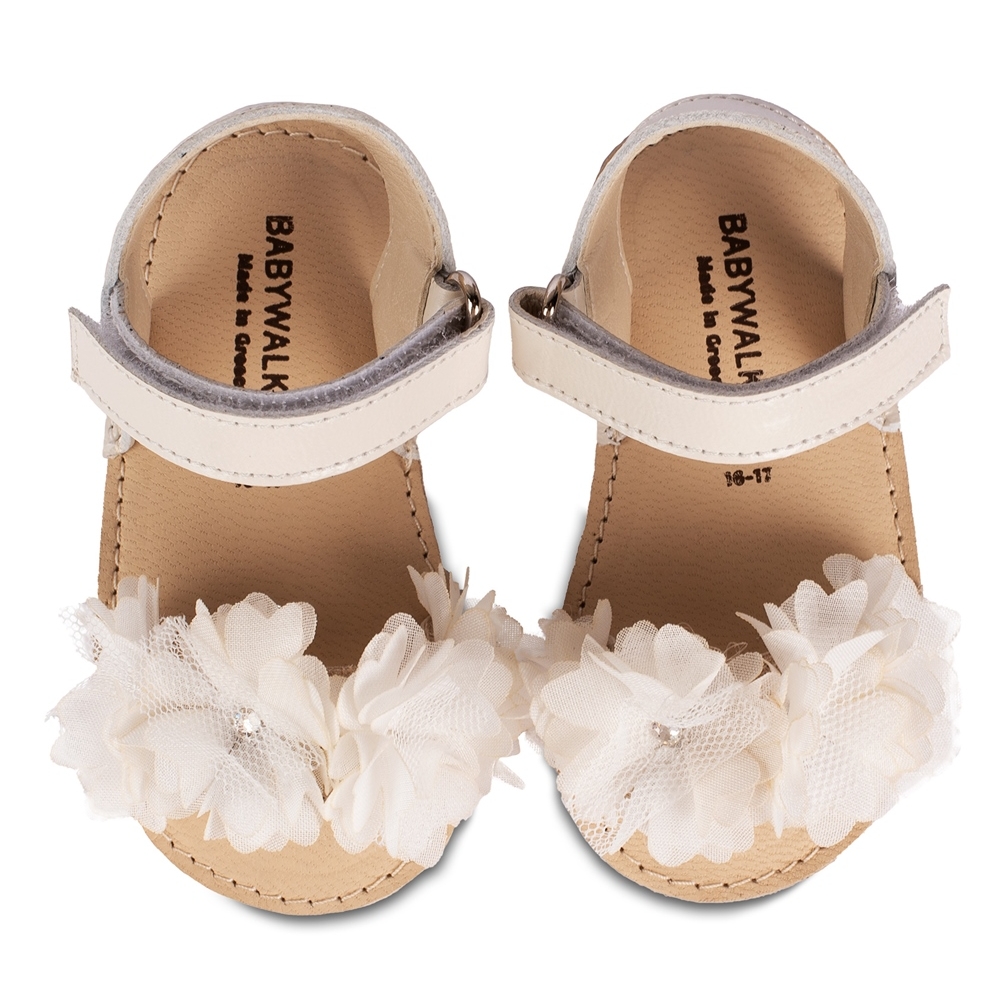 Δερμάτινο πέδιλο με chiffon λουλούδια, σε εκρού χρώμα. Παπουτσάκια αγκαλιάς.