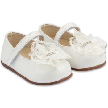 Δερμάτινο γοβάκι με μονή μπαρέτα και διακοσμητικό με δαντέλα και στρας, απο δέρμα πέρλα σε εκρού χρώμα. Παπουτσάκια για τα πρώτα βήματα.