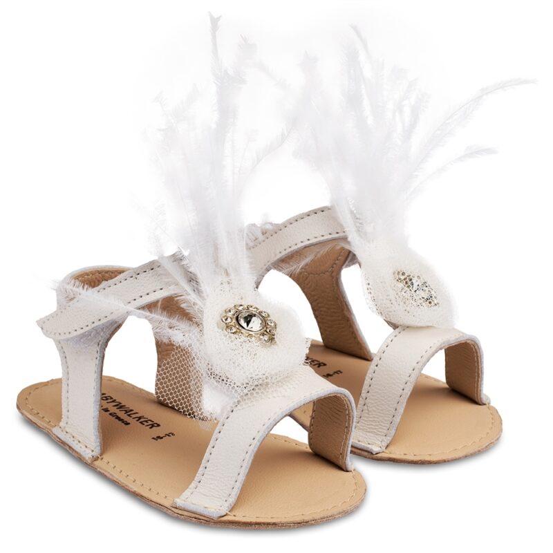 Δερμάτινο πέδιλο με χειροποίητο διακοσμητικό με στρας και πούπουλα, σε εκρού χρώμα.
