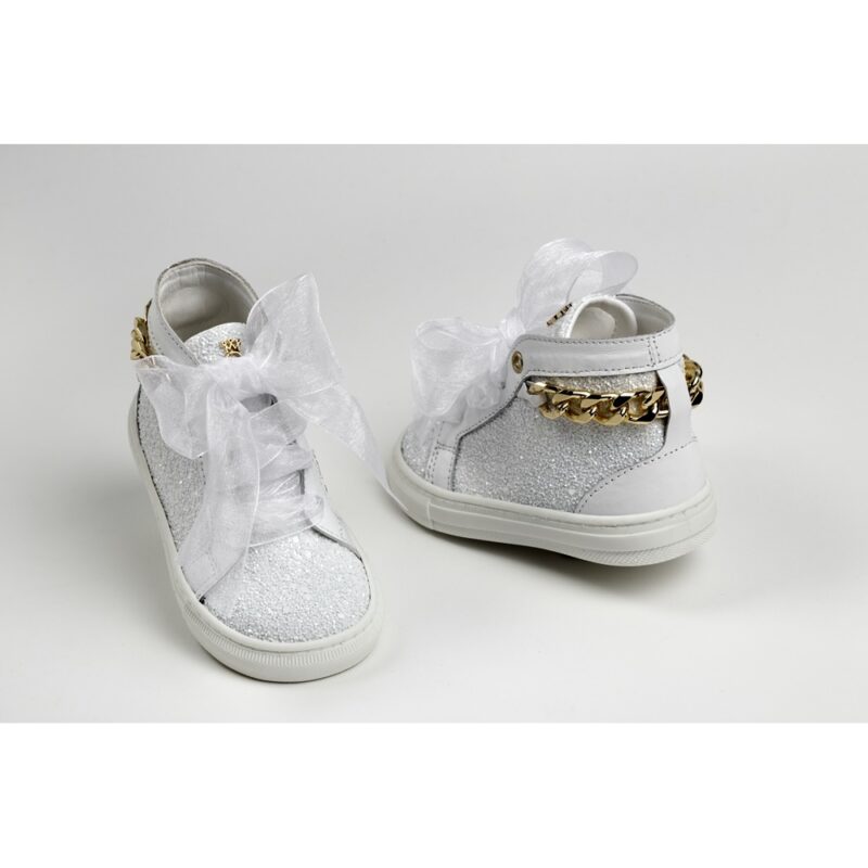 Μποτάκι περπατήματος από λευκό δέρμα και γκλίτερ με χρυσή αλυσίδα στο πίσω μέρος και δέσιμο με οργαντίνα.