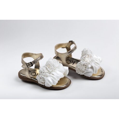 Σανδάλι περπατήματος από εκρού δέρμα διακοσμημένο με dusty pink κρεπ σατέν και offwhite δαντέλα, κλείσιμο με αγκράφα.