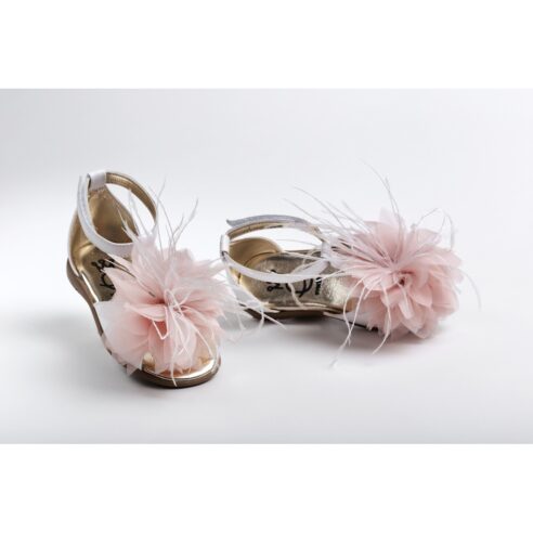 Σανδάλι περπατήματος από εκρού δέρμα διακοσμημένο με dusty pink τριαντάφυλλο από μουσελίνα δαντέλα και φτερά, κλείσιμο με Velcro.