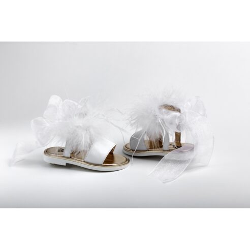 Σανδάλι περπατήματος από λευκό δέρμα διακοσμημένο με dusty pink oversized λουλούδι από μουσελίνα και φτερά, κλείσιμο με Velcro.
