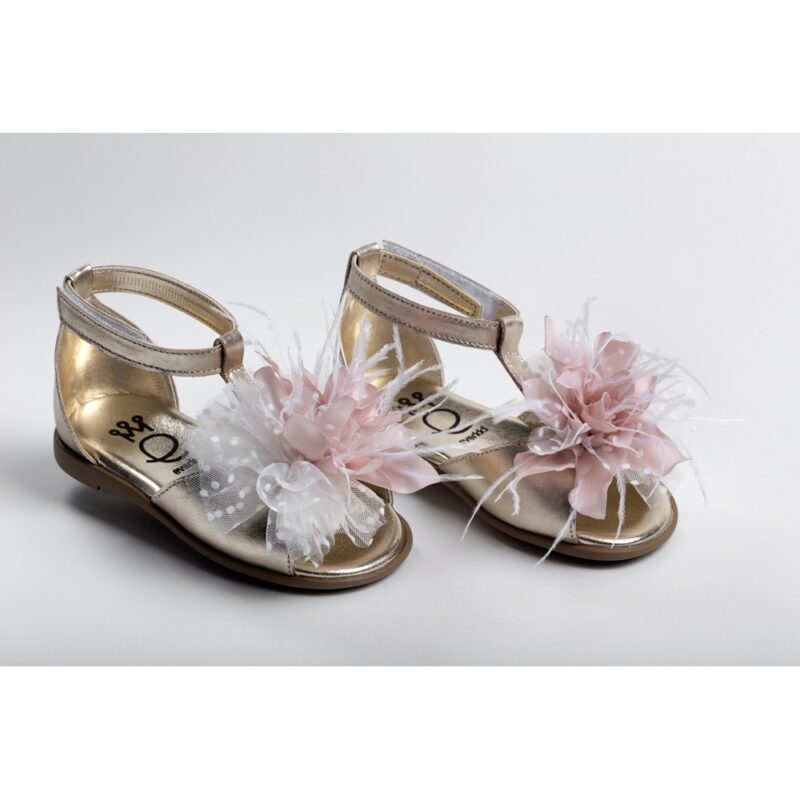 Σανδάλι περπατήματος από χρυσό δέρμα, διακοσμημένο με λουλούδι από dusty pink σατεν, πουά τούλι και φτερά, κλείσιμο με Velcro.