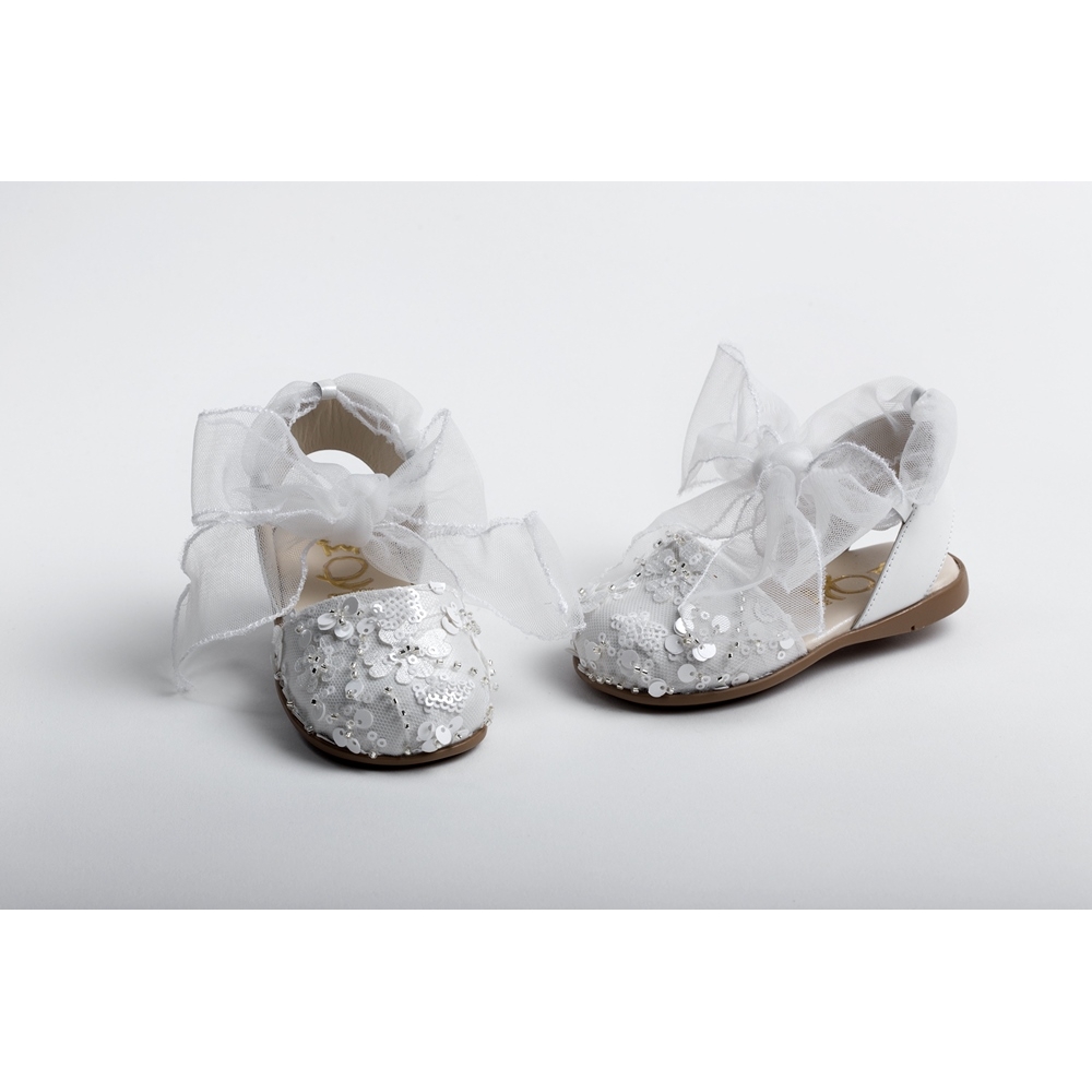 Εσπαντρίγια περπατήματος από εκρού δέρμα και σατέν, διακοσμημένη με 3D λουλούδια, δέσιμο με offwhite τούλι.