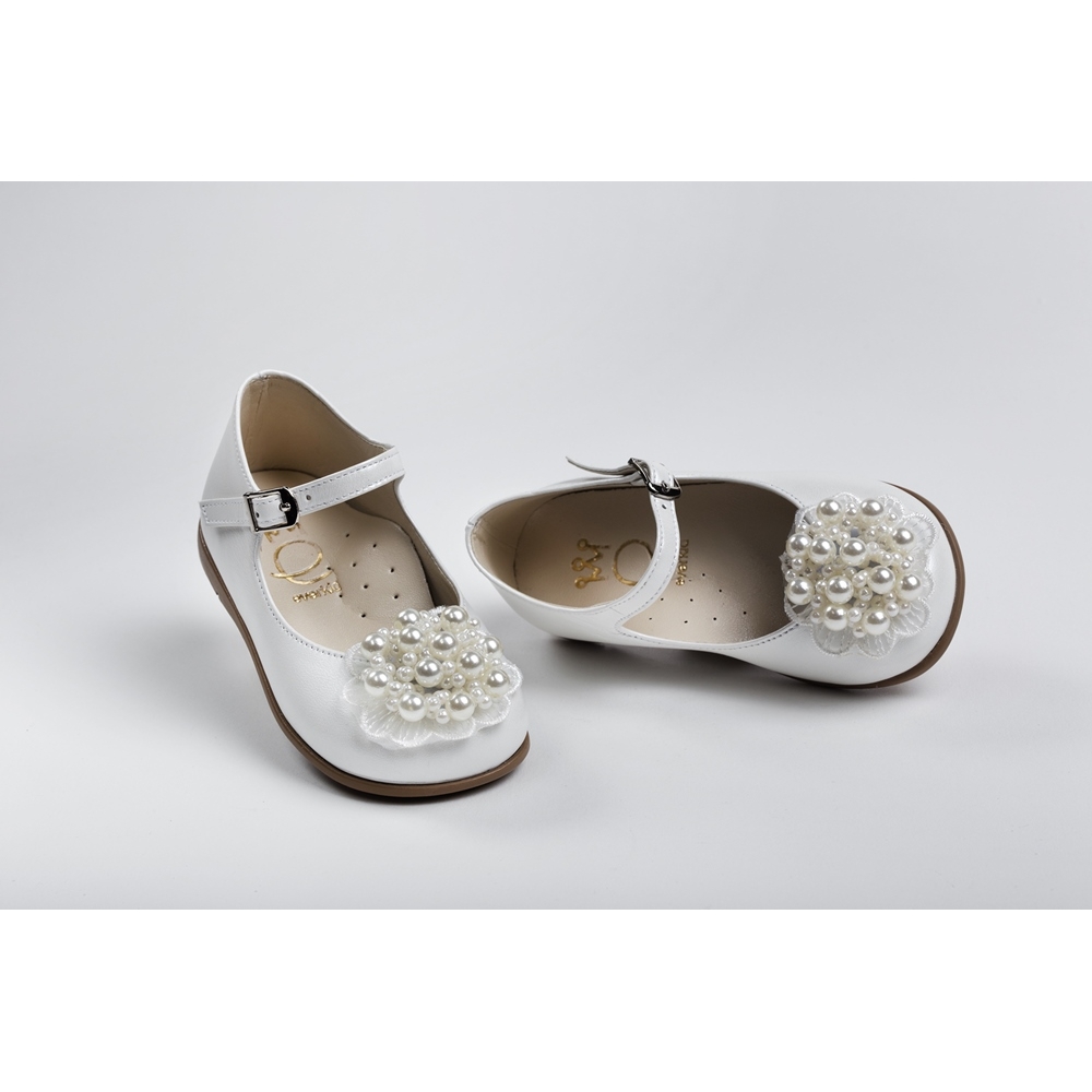 Μπαλαρίνα περπατήματος από εκρού δέρμα, διακοσμημένη με κεντημένη μαργαρίτα και πέρλες, κλείσιμο με αγκράφα.