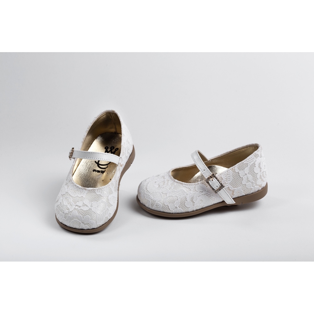 Μπαλαρίνα περπατήματος από εκρού σατέν ντυμένο με δαντέλα, κλείσιμο με χρυσή αγκράφα διακοσμημένη με στρας.