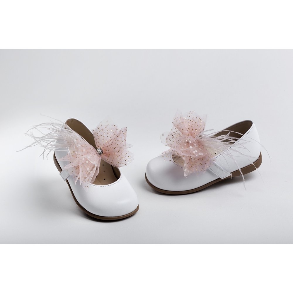 Μπαλαρίνα περπατήματος από λευκό δέρμα διακοσμημένη με πουά τούλι, γκλίτερ, στρας και φτερά, κλείσιμο με Velcro.