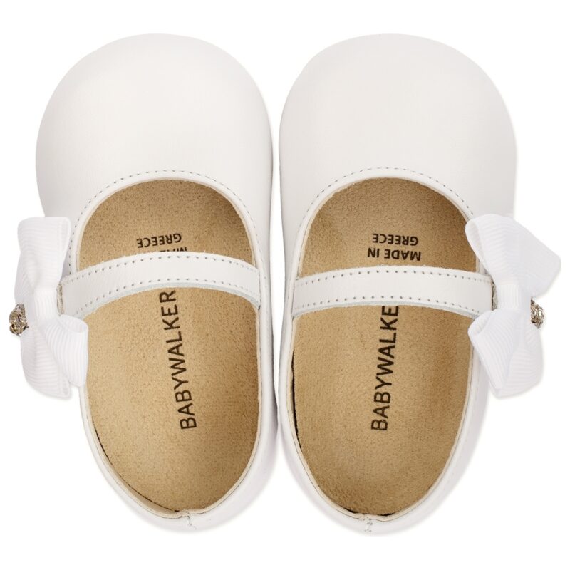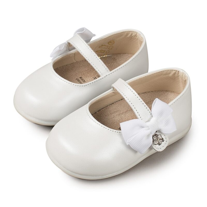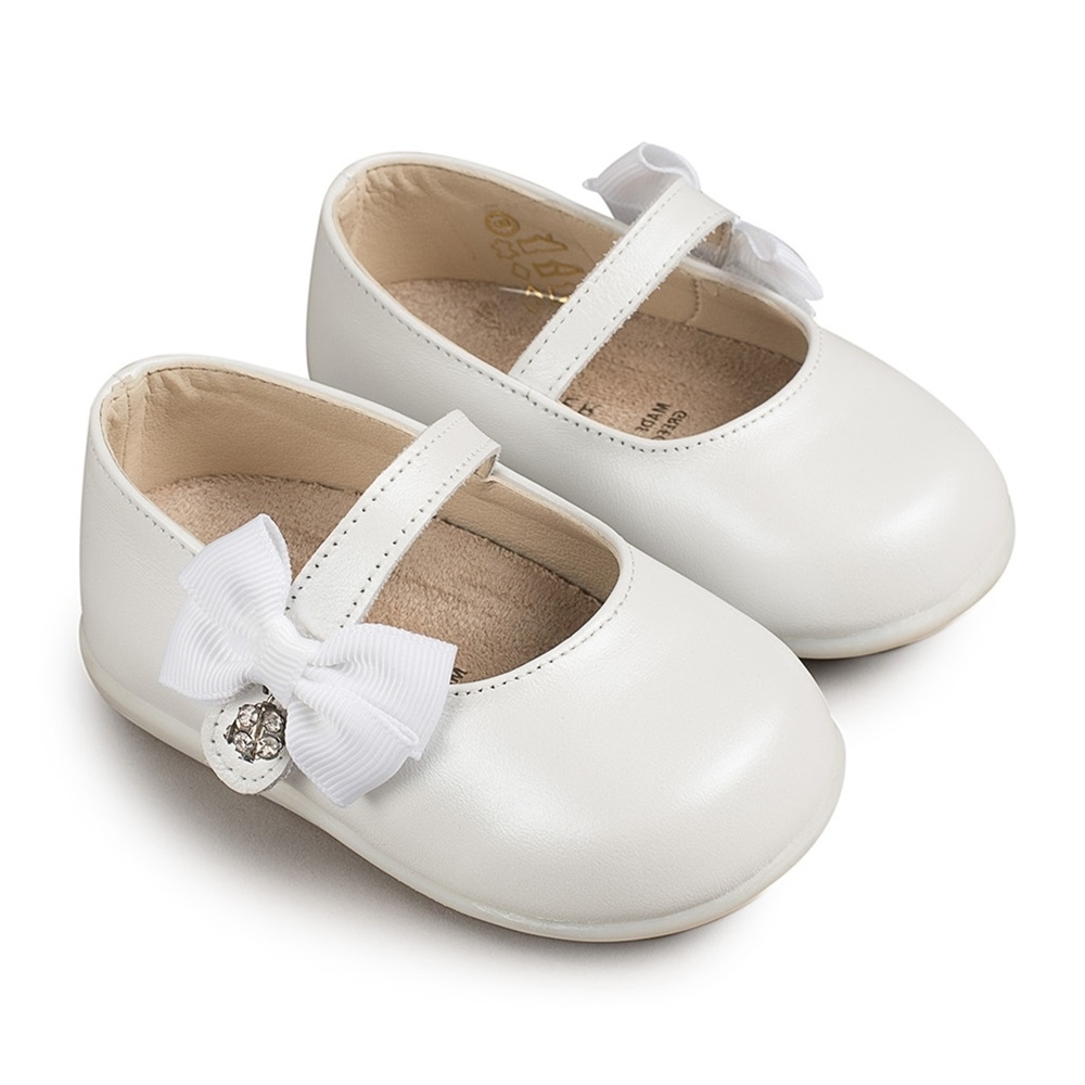 Δερμάτινο γοβάκι με φιόγκο gros grain και μονή μπαρέτα, σε λευκό χρώμα. Παπουτσάκια για τα πρώτα βήματα.