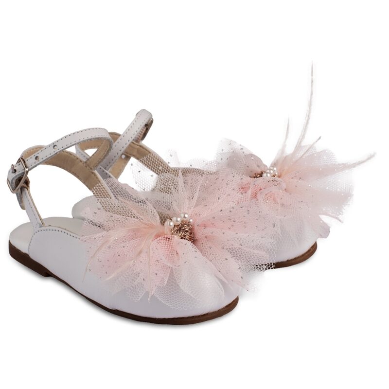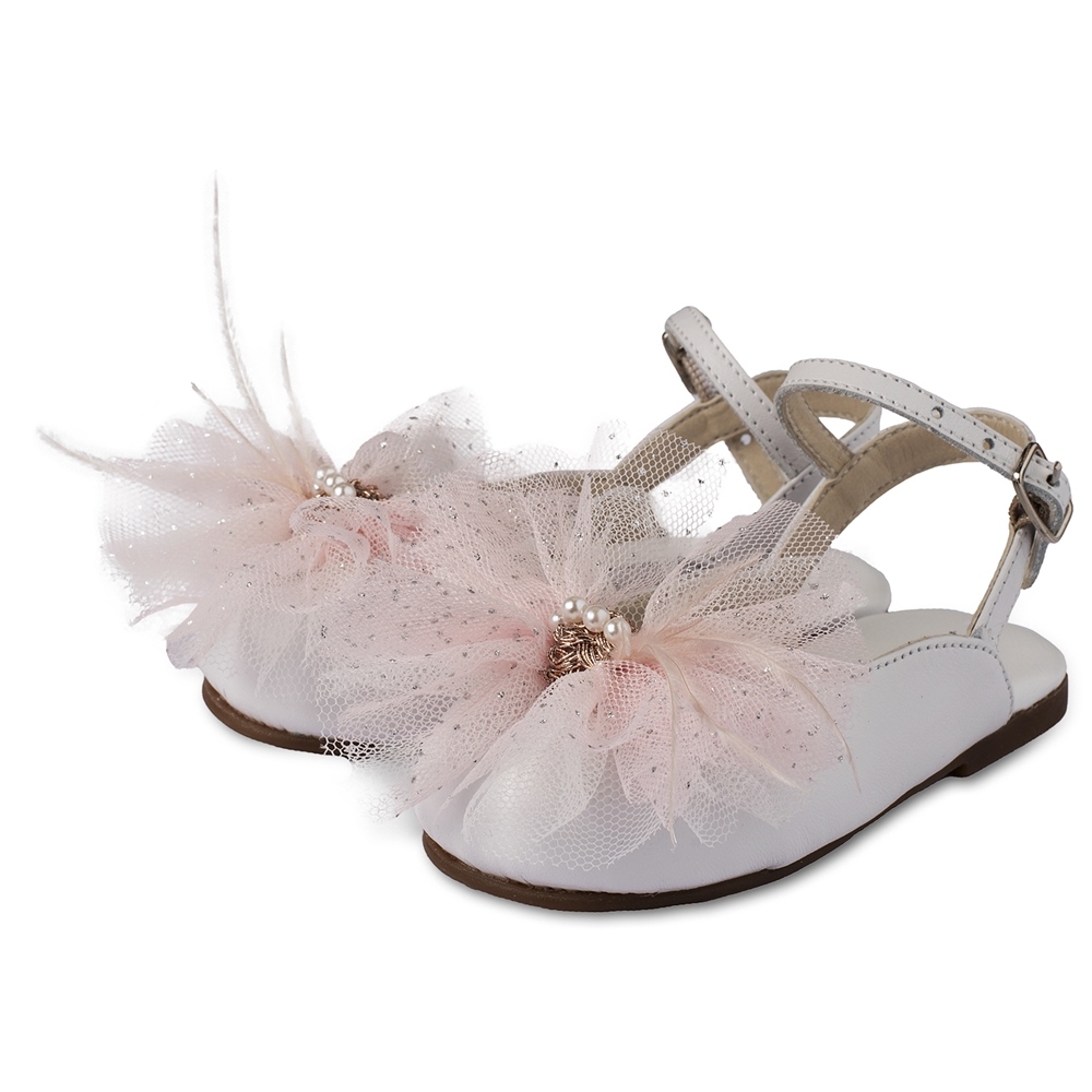 Δερμάτινο πέρλα σαμπό, διακοσμημένο με χειροποίητο φιόγκο από τούλι και πούπουλα, σε λευκό – ροζ χρώμα. Παπουτσάκια περπατήματος.
