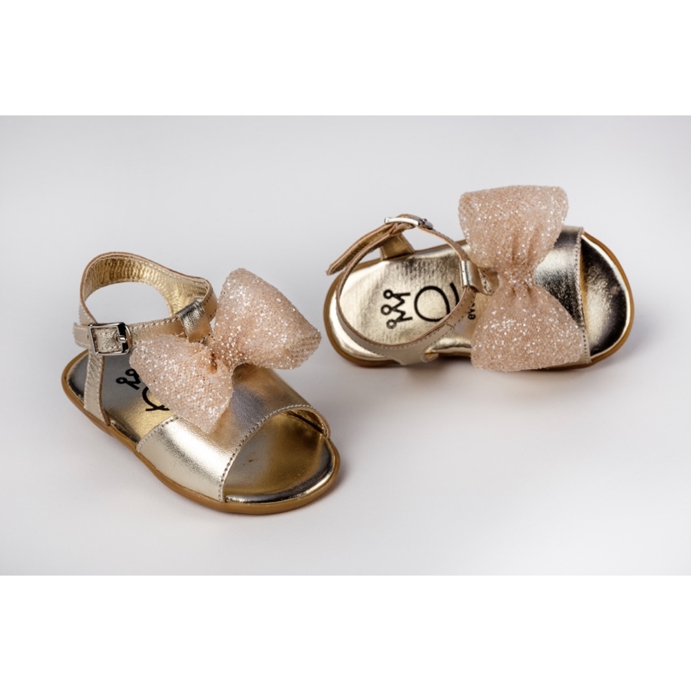 Σανδάλι για τα πρώτα βήματα από χρυσό δέρμα, διακοσμημένο με φιόγκο από μπεζ γκλίτερ, κλείσιμο με αγκράφα.