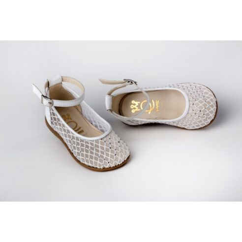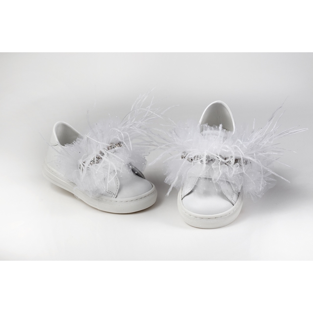 Sneaker περπατήματος από λευκό δέρμα διακοσμημένο με λευκό γκλίτερ τούλι, φτερά και στρας, κλείσιμο με velcro (“χρατς”).