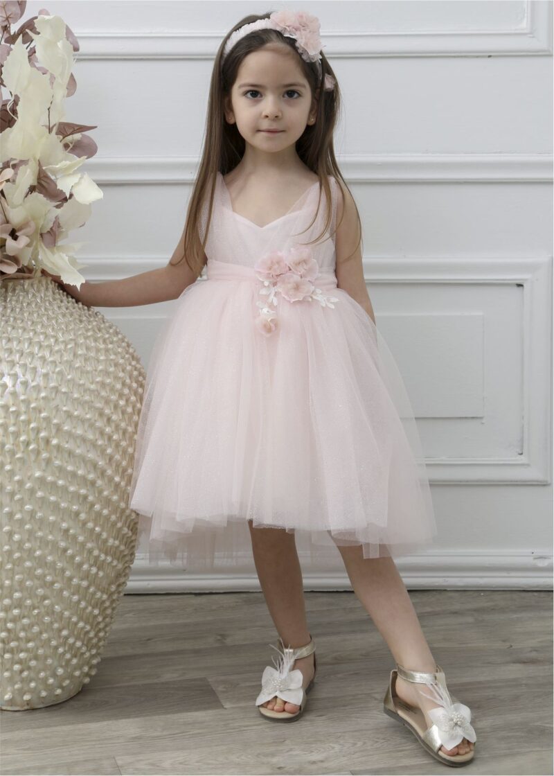 Φόρεμα βάπτισης της εταιρείας Mi Chiamo K4554 σε ροζ αντικέ χρώμα, κατασκευασμένο από τούλι με glitter και διακοσμητικά λουλούδια. Το σύνολο συνοδεύεται από ασορτί κορδέλα.