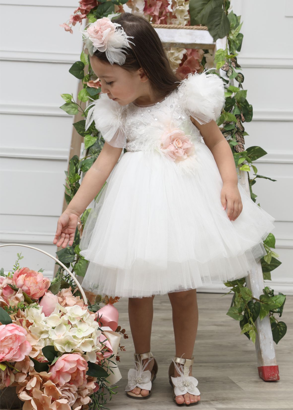 Φόρεμα βάπτισης της εταιρείας Mi Chiamo K4564 σε ιβουάρ χρώμα, κατασκευασμένο από τούλι, παγιέτες και διακοσμητικό λουλούδι. Το σύνολο συνοδεύεται από ασορτί στέκα.