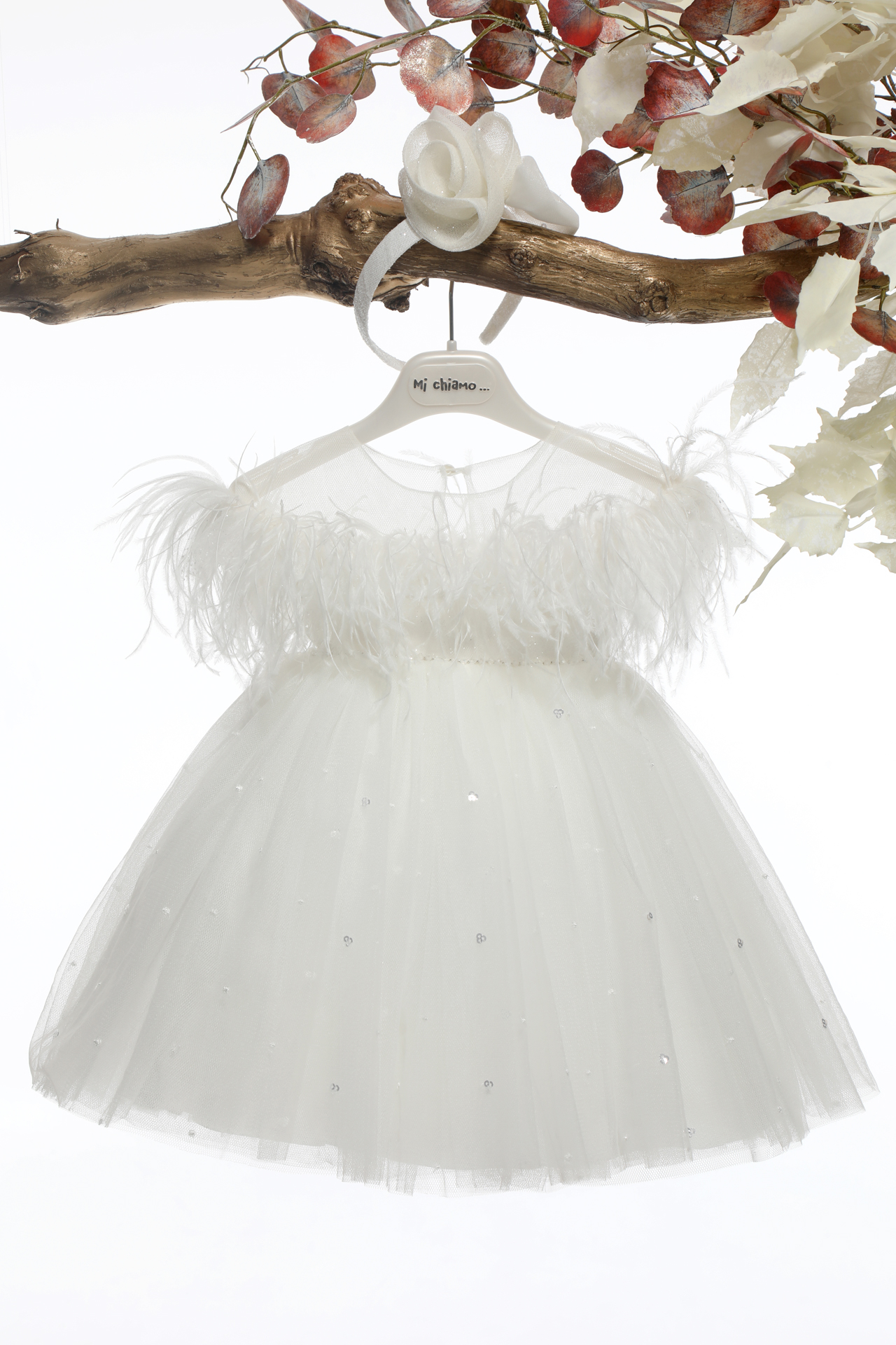Φόρεμα βάπτισης της εταιρείας Mi Chiamo K4580Ι σε ιβουάρ χρώμα διακοσμημένο με πούπουλα. Το σύνολο συνοδεύεται από ασορτί στέκα.