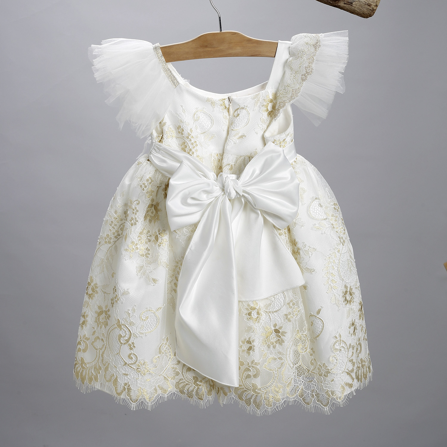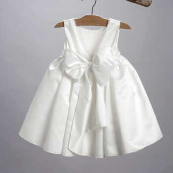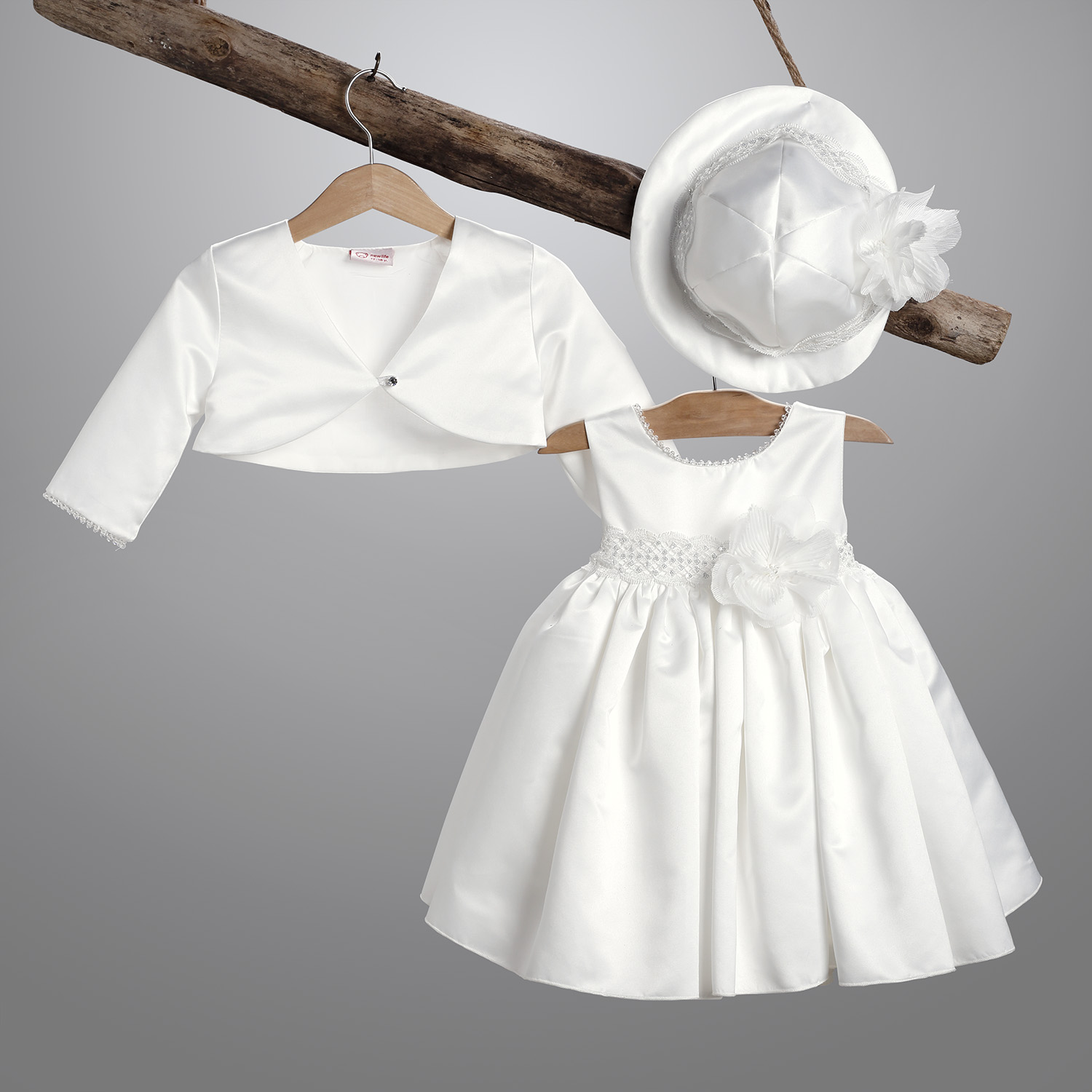 Φόρεμα, από εκρού σατέν, που σχηματίζει πιέτες από τη μέση και κάτω.. Στο εσωτερικό του φορέματος υπάρχει βαμβακερή φόδρα. Ο στολισμός αποτελείται από μια ζώνη από εκρού σατέν που σχηματίζει φιόγκο στο πίσω μέρος. Μπροστά υπάρχει μια τρέσα από δαντέλα πάνω στην οποία είναι ραμμένο ένα λουλούδι από μουσελίνα και τούλι με στρασάκι στο εσωτερικό του. Ο λαιμός είναι στολισμένος με μια τρέσα από κρυσταλλάκια. Το φόρεμα διατίθεται επίσης σε άσπρο, ροζ, μπεζ, σωμόν και σάπιο μήλο χρώμα.