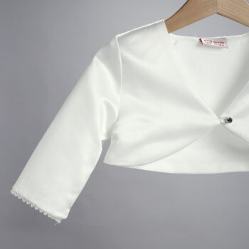 Ζακετάκι σε εκρού χρώμα από σατέν, επενδυμένο με βαμβακερή φόδρα, με ένα κουμπάκι στρας που χρησιμοποιείται για το κλείσιμο. Διατίθεται επίσης σε άσπρο, ροζ, μπεζ, σωμόν και σάπιο μήλο χρώμα.