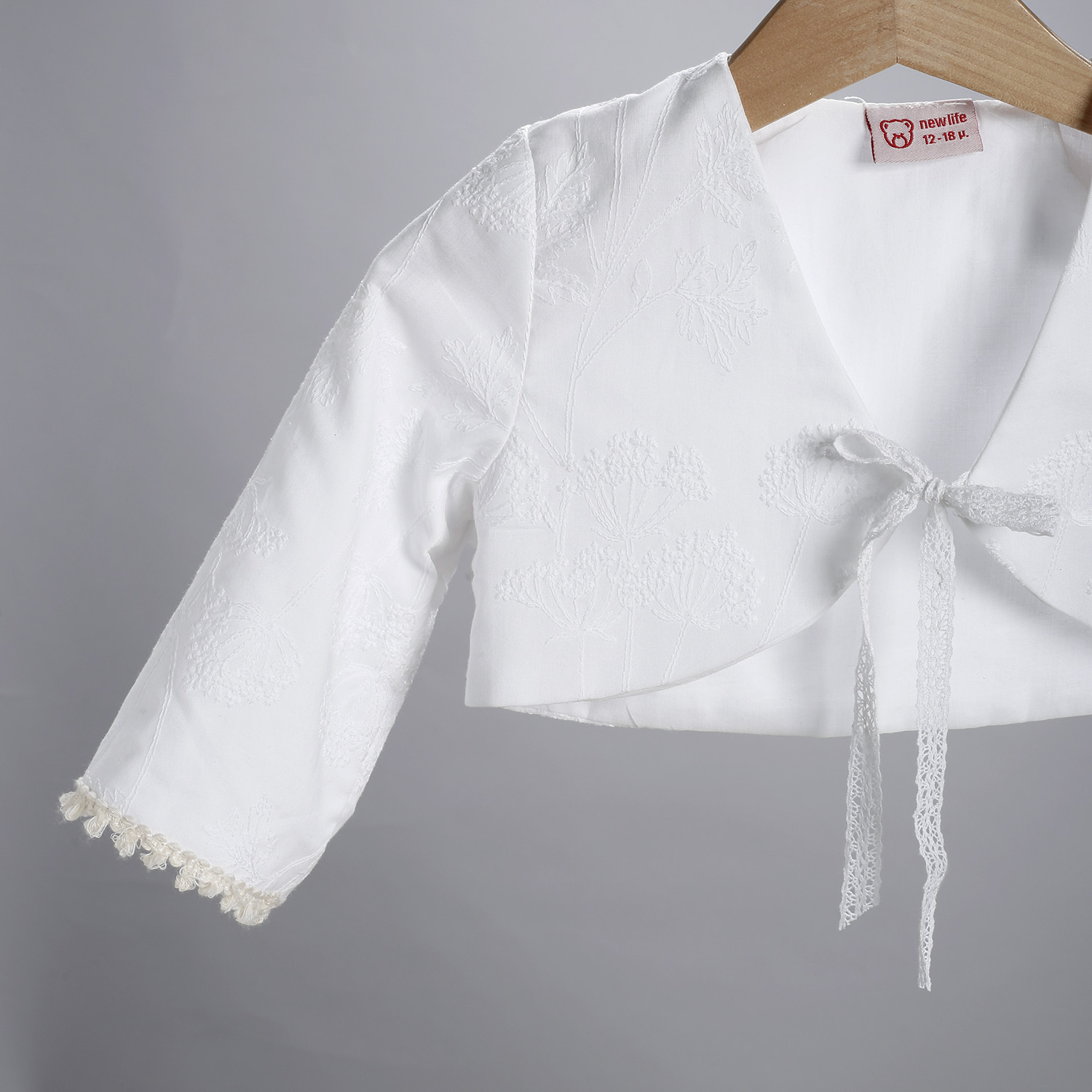 Ζακετάκι σε άσπρο χρώμα από μπροντερί, επενδυμένο με βαμβακερή φόδρα με δυο κρεμαστά κορδελάκια που χρησιμοποιούνται για το δέσιμο.