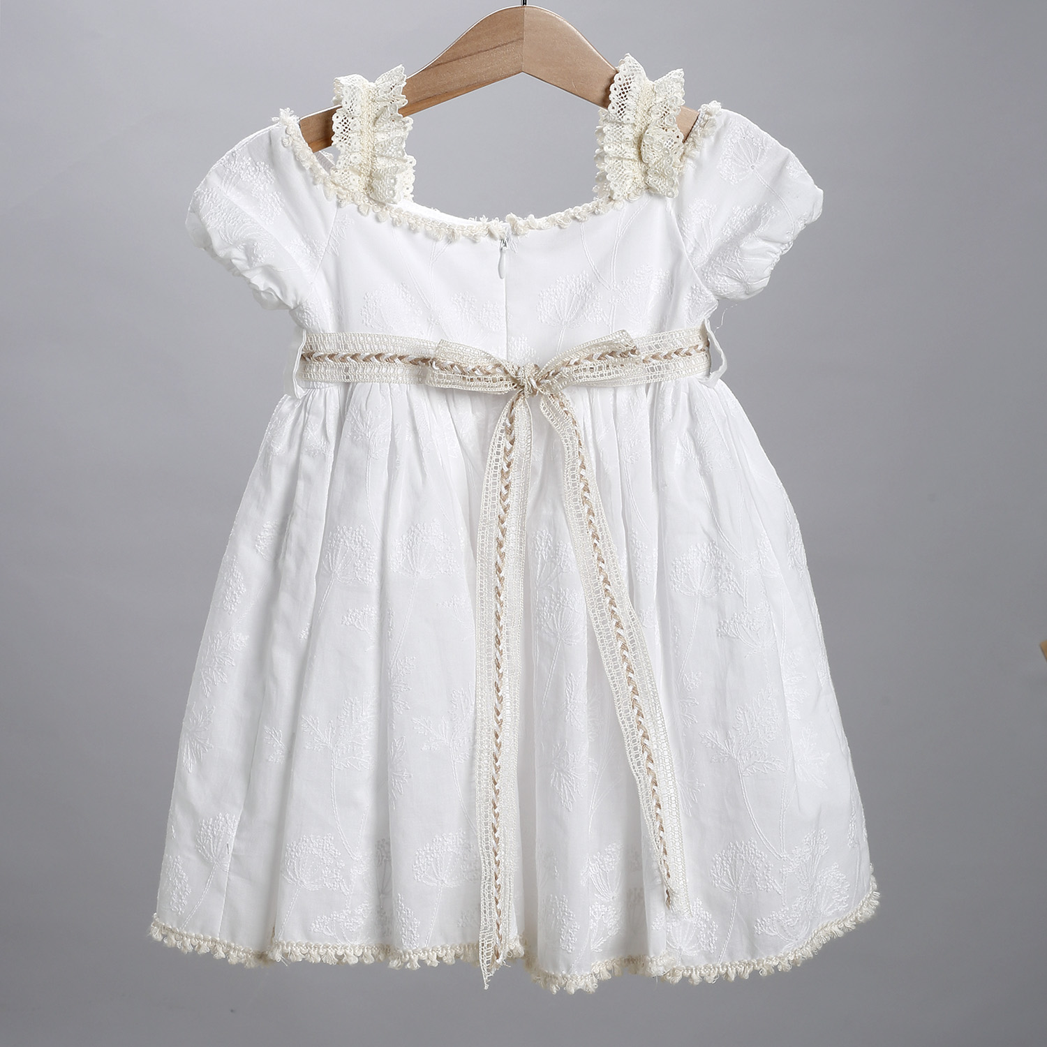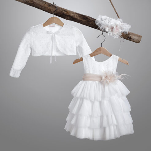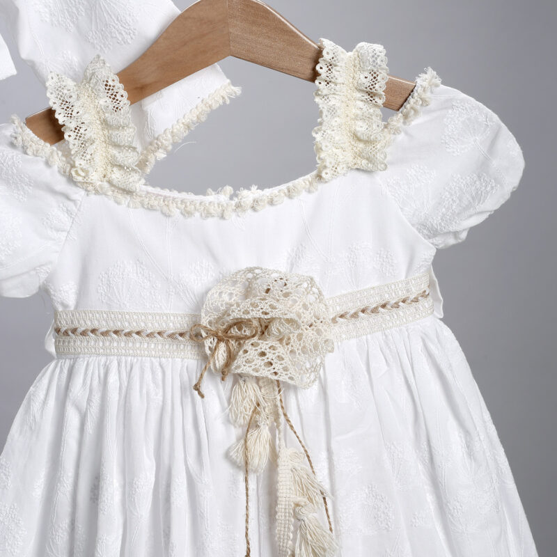 Φόρεμα σε άσπρο χρώμα από μπροντερί. Στο εσωτερικό του φορέματος υπάρχει διπλή βαμβακερή φόδρα. Ο στολισμός αποτελείται από μια ζώνη από μπεζ πλεκτό δαντελάκι που σχηματίζει φιόγκο στο πίσω μέρος. Μπροστά υπάρχει ένα λουλούδι από πλεκτό δαντελάκι, το οποίο είναι ραμμένο πάνω στη ζώνη και κρεμαστές τρέσες. Ο λαιμός και το τελείωμα της φούστας είναι στολισμένα με δαντελένιο τρεσάκι. Η ζώνη και ο στολισμός διατίθενται σε πολλά χρώματα.