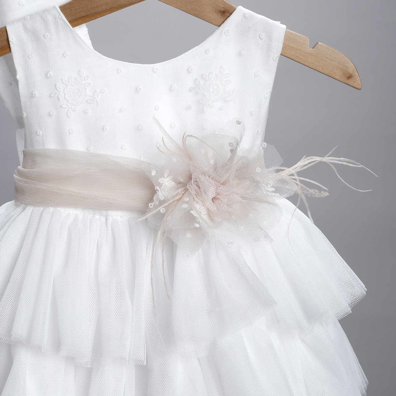 Άσπρο φόρεμα από τούλι στολισμένο με τούλινη ζώνη, λουλούδι και πούπουλα.