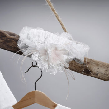 Κορδέλα από άσπρο τούλι στολισμένη με λουλούδι από δαντέλα και τούλι.