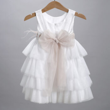 Φόρεμα σε άσπρο χρώμα από τούλι. Στο εσωτερικό του φορέματος υπάρχει διπλή βαμβακερή φόδρα. Ο στολισμός αποτελείται από μια τούλινη ζώνη η οποία σχηματίζει φιόγκο στο πίσω μέρος. Μπροστά υπάρχει ένα λουλούδι από δαντέλα και τούλι το οποίο είναι ραμμένο πάνω στη ζώνη μαζί με πούπουλα. Το φόρεμα διατίθεται επίσης σε εκρού, ροζ, μπεζ, σωμόν και σάπιο μήλο χρώμα. Ο στολισμός διατίθεται σε πολλά χρώματα.