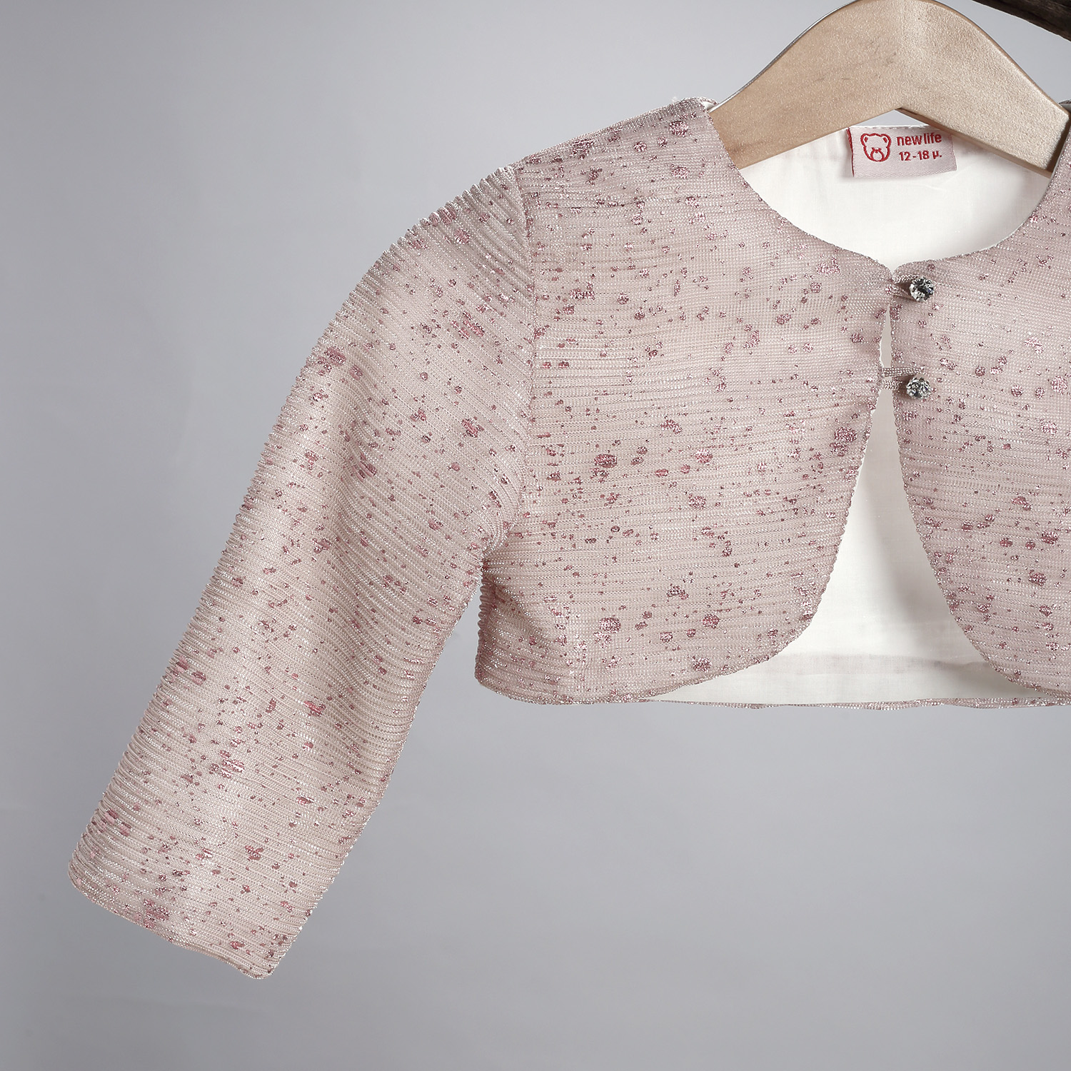 Ζακετάκι σε σάπιο μήλο χρώμα από γκλίτερ τούλι, επενδυμένο με βαμβακερή φόδρα, με δυο στρασάκια που χρησιμοποιούνται για το κλείσιμο. Διατίθεται και σε μπεζ χρώμα.