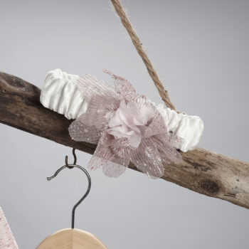 Κορδέλα από μπεζ μουσελίνα, στολισμένη με λουλούδι από γκλίτερ τούλι.