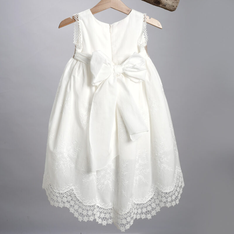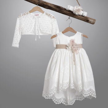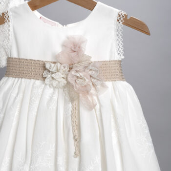 Φόρεμα σε εκρού χρώμα από κεντημένη ποπλίνα. Στο εσωτερικό του φορέματος υπάρχει διπλή βαμβακερή φόδρα. Ο στολισμός αποτελείται από μια ζώνη από ποπλίνα η οποία σχηματίζει φιόγκο στο πίσω μέρος. Μπροστά υπάρχει μια ζώνη από δαντελένια τρέσα πάνω στην οποία είναι ραμμένα λουλούδια από δαντέλα και τούλι και κορδελάκια. Το φόρεμα διατίθεται και σε άσπρο χρώμα, ο στολισμός σε πολλά χρώματα.