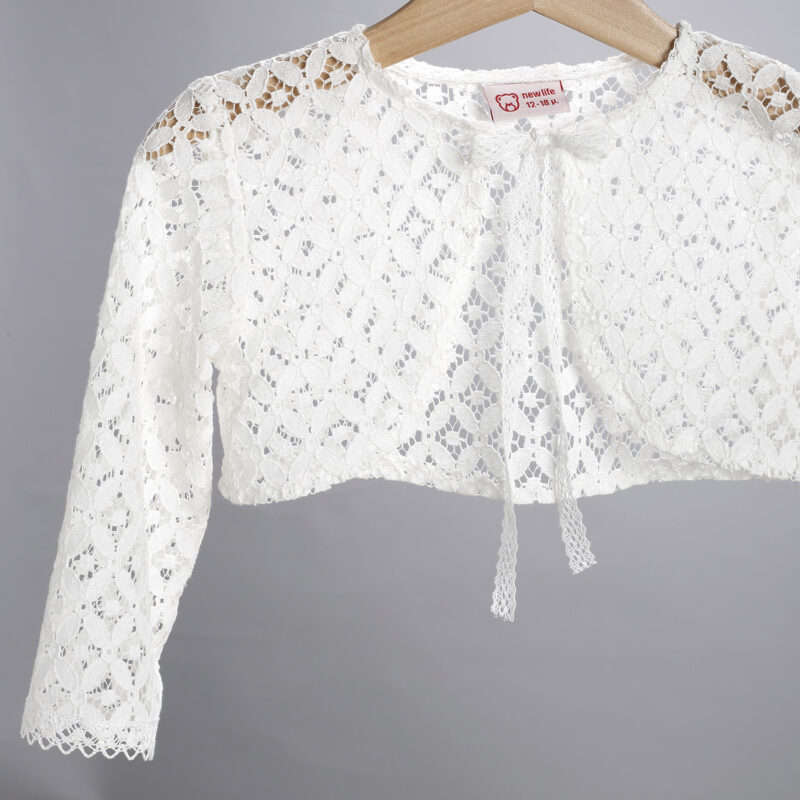 Ζακετάκι σε εκρού χρώμα από δαντέλα με δυο κορδελάκια που χρησιμοποιούνται για το δέσιμο. Διατίθεται και σε άσπρο χρώμα.