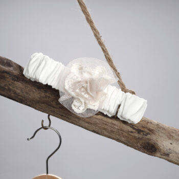 Κορδέλα από εκρού ποπλίνα στολισμένη με λουλούδι από δαντέλα και τούλι.