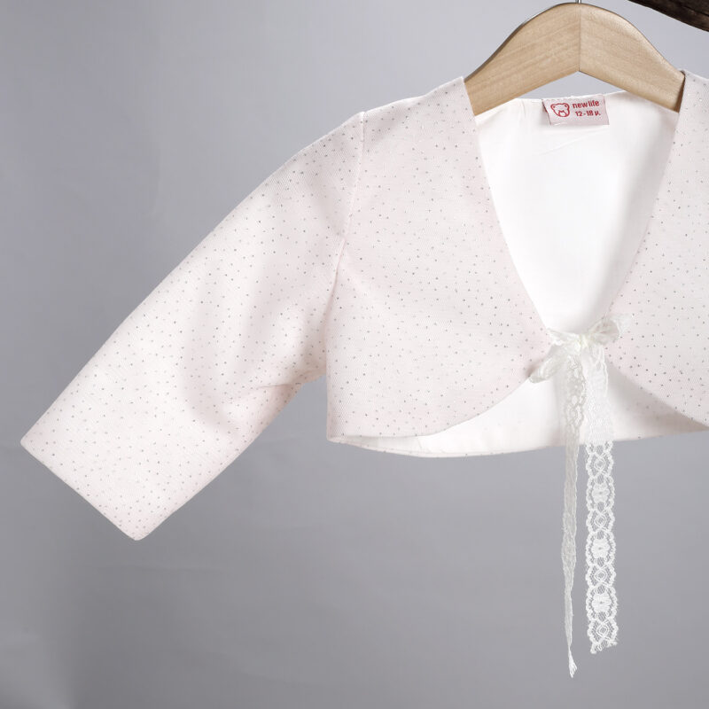 Ζακετάκι σε ροζ χρώμα από ιριζέ τούλι, επενδυμένο με βαμβακερή φόδρα με δυο κρεμαστά κορδελάκια που χρησιμοποιούνται για το δέσιμο.