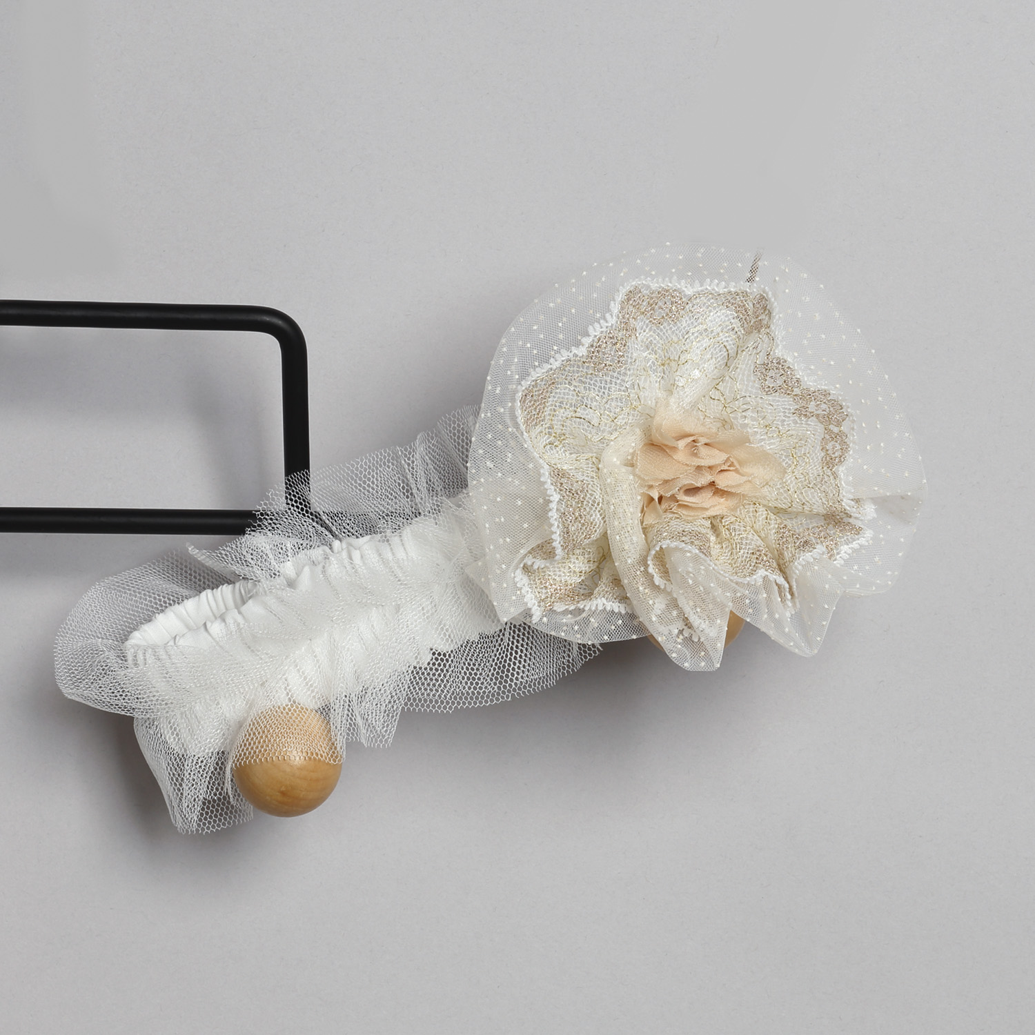 Φόρεμα από εκρού τούλι με κεντητά κρόσια στολισμένο με δαντελένιο λουλούδι.
