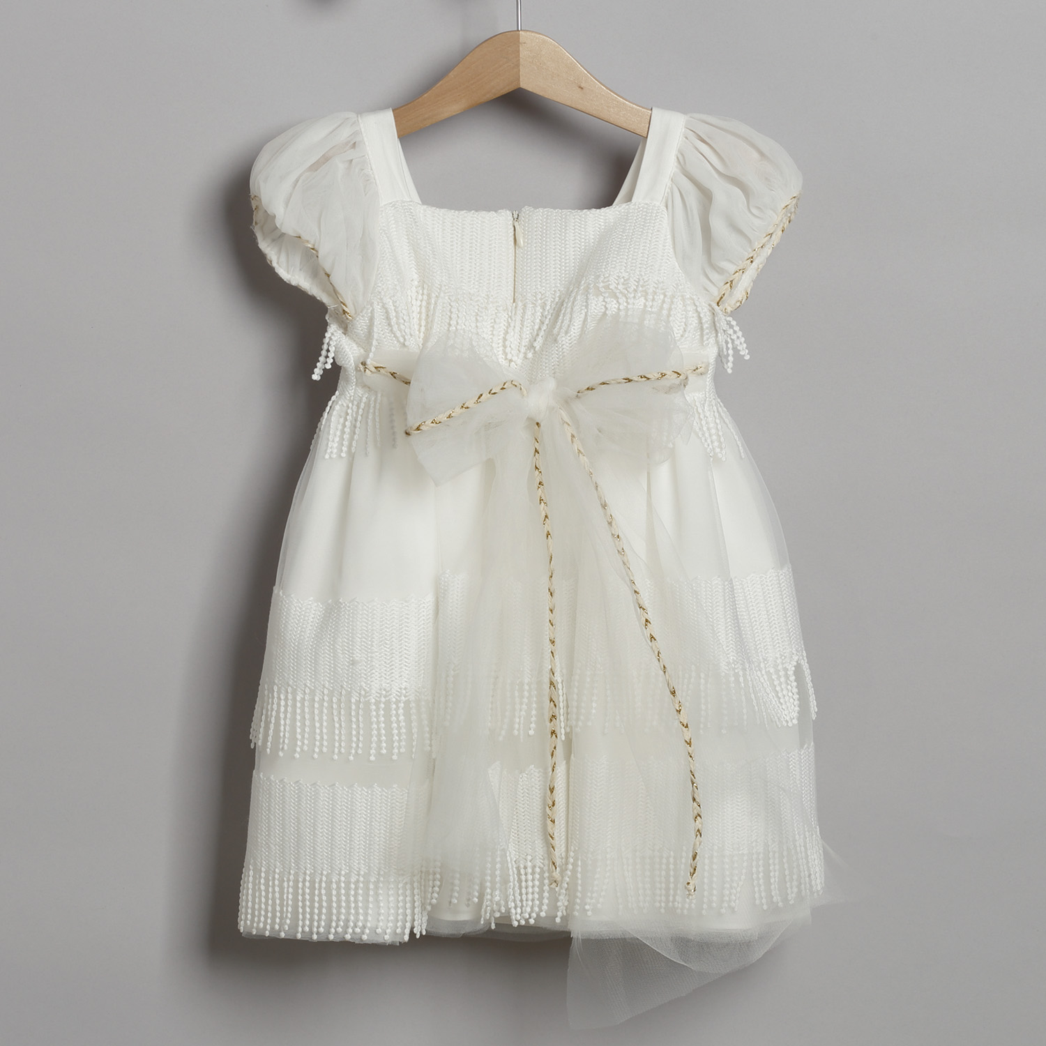 Φόρεμα από τούλι με κεντητά κρόσια σε εκρού χρώμα . Από μέσα υπάρχει δεύτερη φούστα από εκρού τούλι. Στο εσωτερικό του φορέματος υπάρχει βαμβακερή φόδρα. Ο στολισμός αποτελείται από ένα δαντελένιο λουλούδι ραμμένο πάνω σε ένα φιόγκο από κορδόνι. Στο πίσω μέρος υπάρχει μια ζώνη από τούλι κσι κορδόνι η οποία σχηματίζει φιόγκο στο πίσω μέρος. Η εσωτερική φούστα, η ζώνη και ο στολισμός διατίθενται σε πολλά χρώματα.Ζακετάκι σε εκρού χρώμα από τούλι, επενδυμένο με βαμβακερή φόδρα με δυο ραμμένα δαντελάκια που χρησιμοποιούνται για το δέσιμο. Κορδέλα από εκρού τούλι στολισμένη με δαντελένιο λουλούδι.