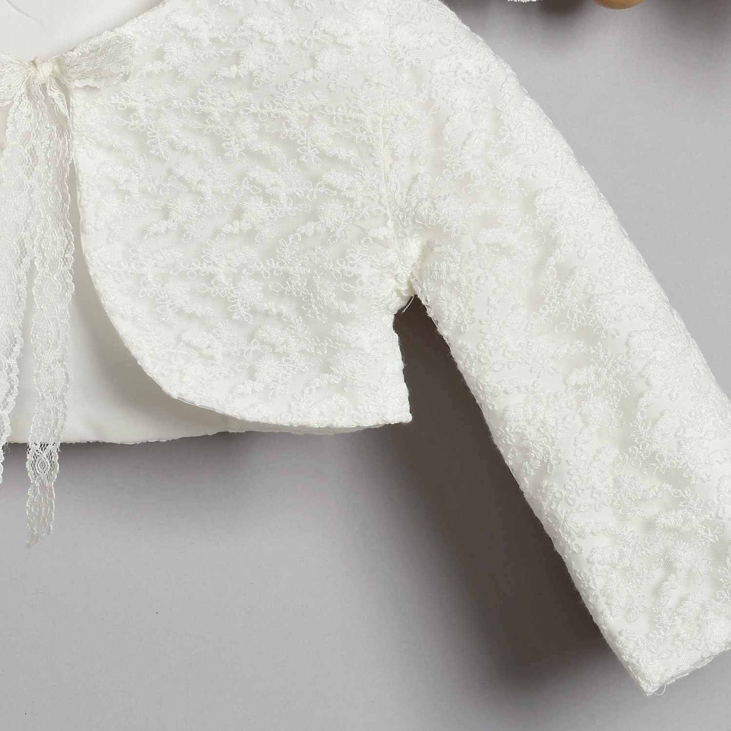 Φόρεμα από δαντέλα σε εκρού χρώμα. Στο εσωτερικό του φορέματος υπάρχει διπλή βαμβακερή φόδρα. Ο στολισμός αποτελείται από μια ζώνη από τυπωμένο τούλι που σχηματίζει φιόγκο στο πίσω μέρος. Μπροστά υπάρχουν δυο λουλούδια από δαντέλα, τούλι και μουσελίνα και κρεμαστά τρεσάκια. Ο στολισμός διατίθεται σε πολλά χρώματα. Ζακετάκι από δαντέλα σε εκρού χρώμα, επενδυμένο με βαμβακερή φόδρα, με δυο κορδελάκια που χρησιμοποιούνται για το δέσιμο. Κορδέλα από εκρού δαντέλα στολισμένη με λουλούδι από μουσελίνα.