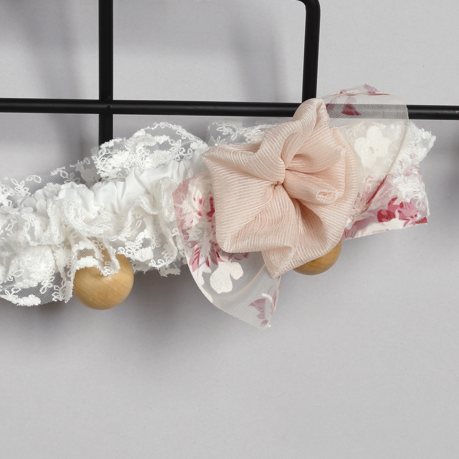 Φόρεμα από εκρού δαντέλα στολισμένο με τούλινη ζώνη και σύνθεση με λουλούδια και τρεσάκια.