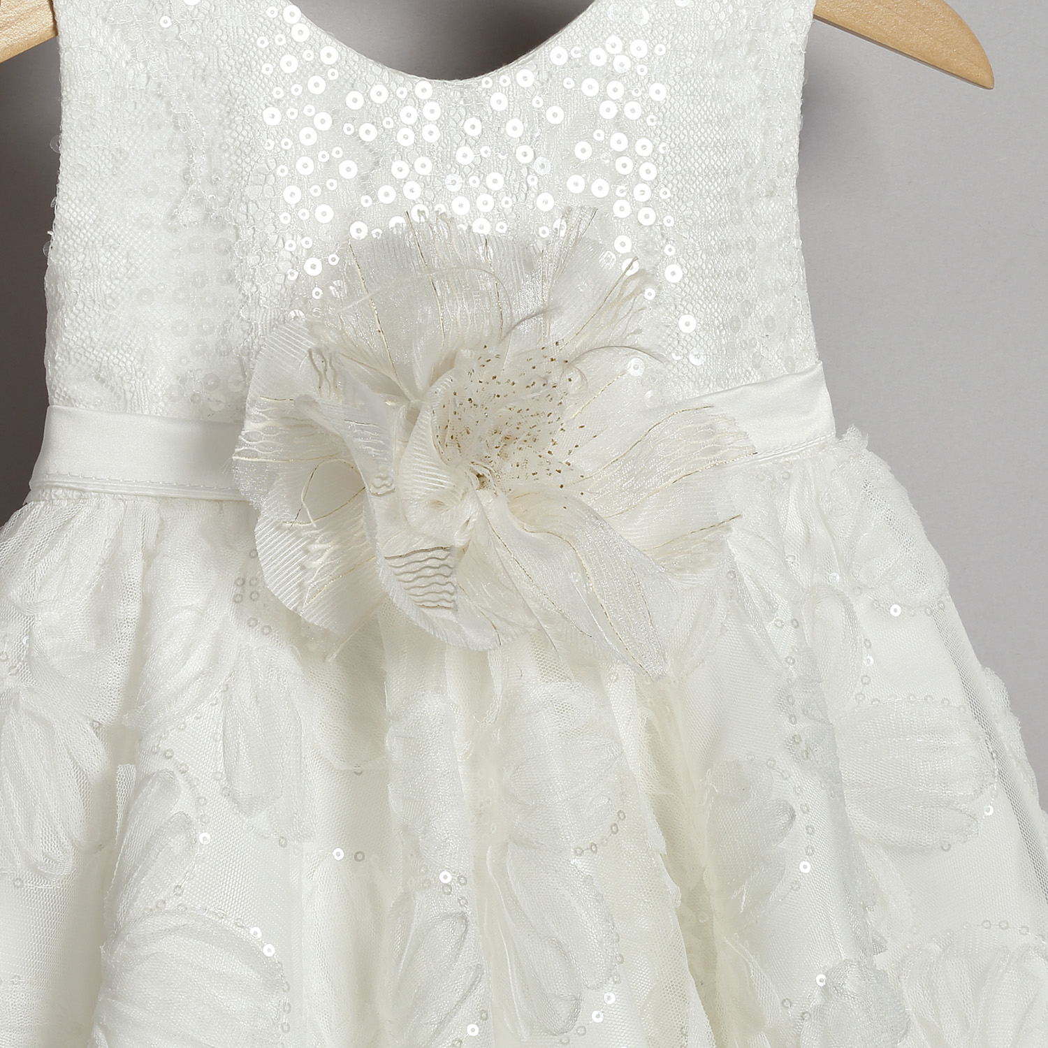 Φόρεμα από εκρού κεντημένη τούλινη δαντέλα στολισμένο με σατέν ζώνη και λουλούδι.