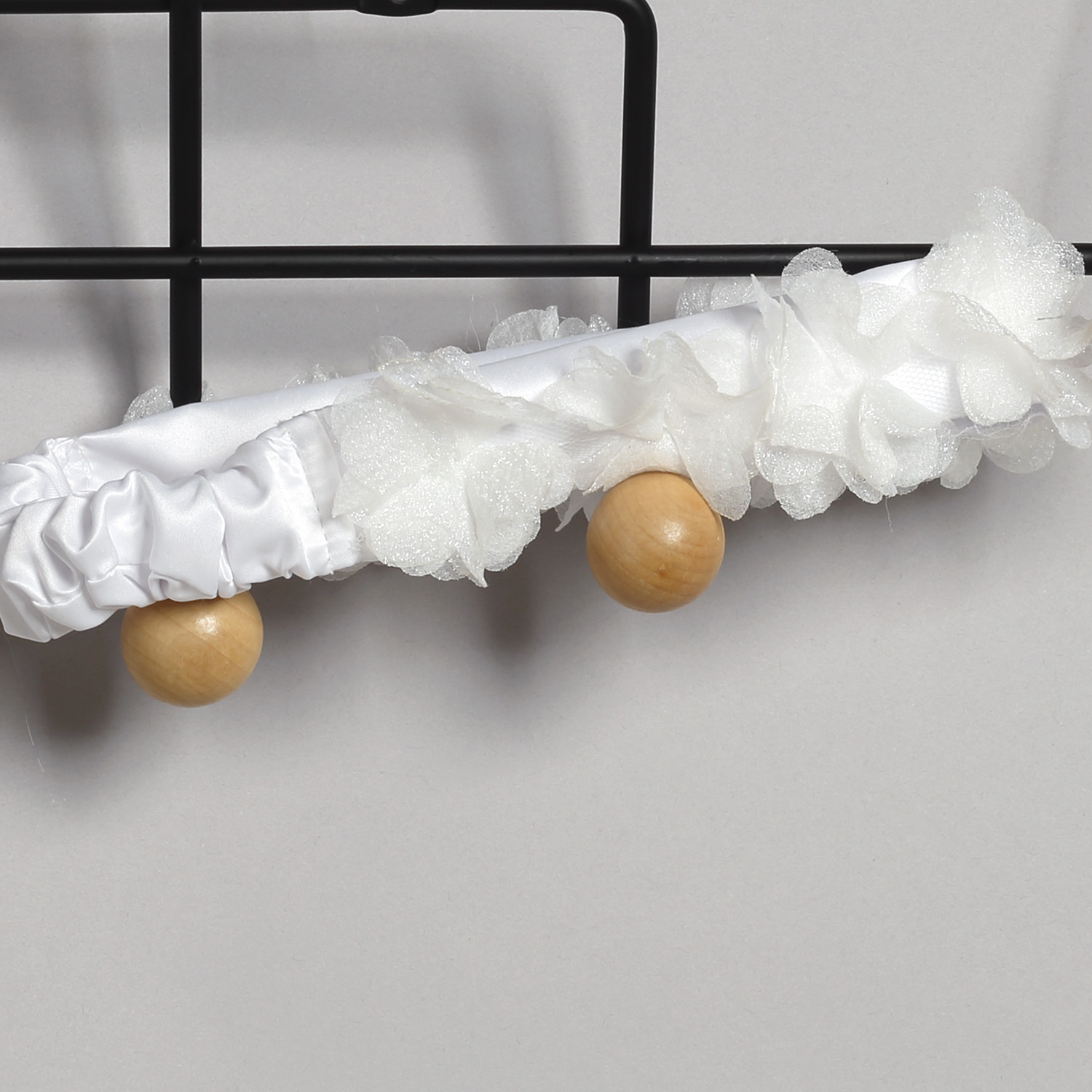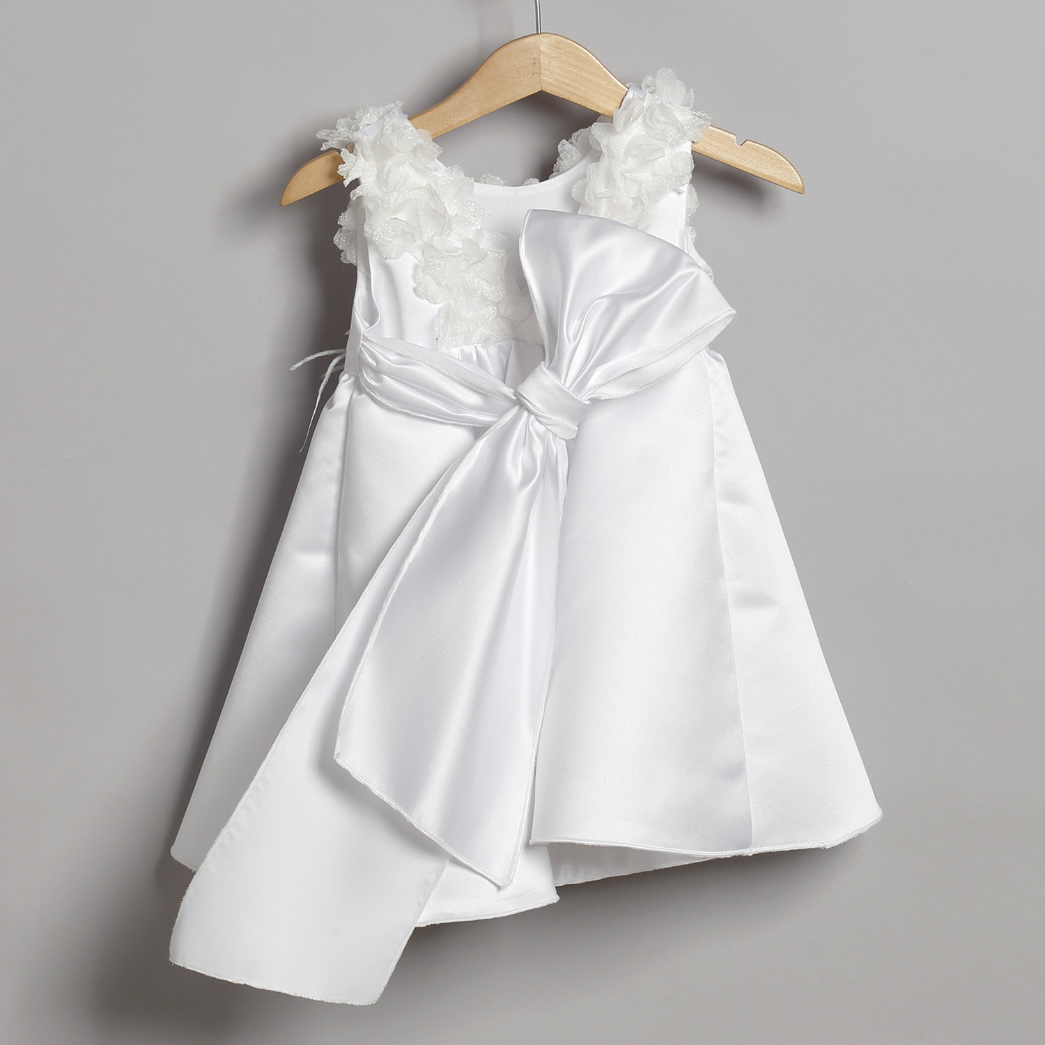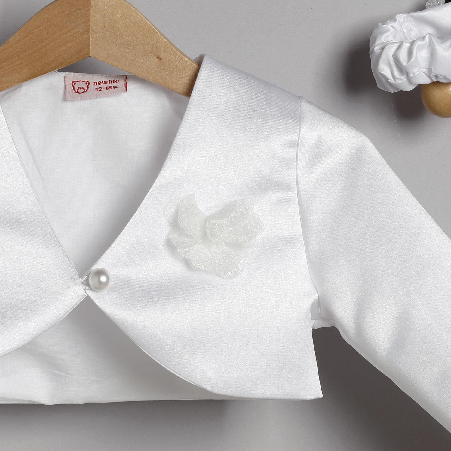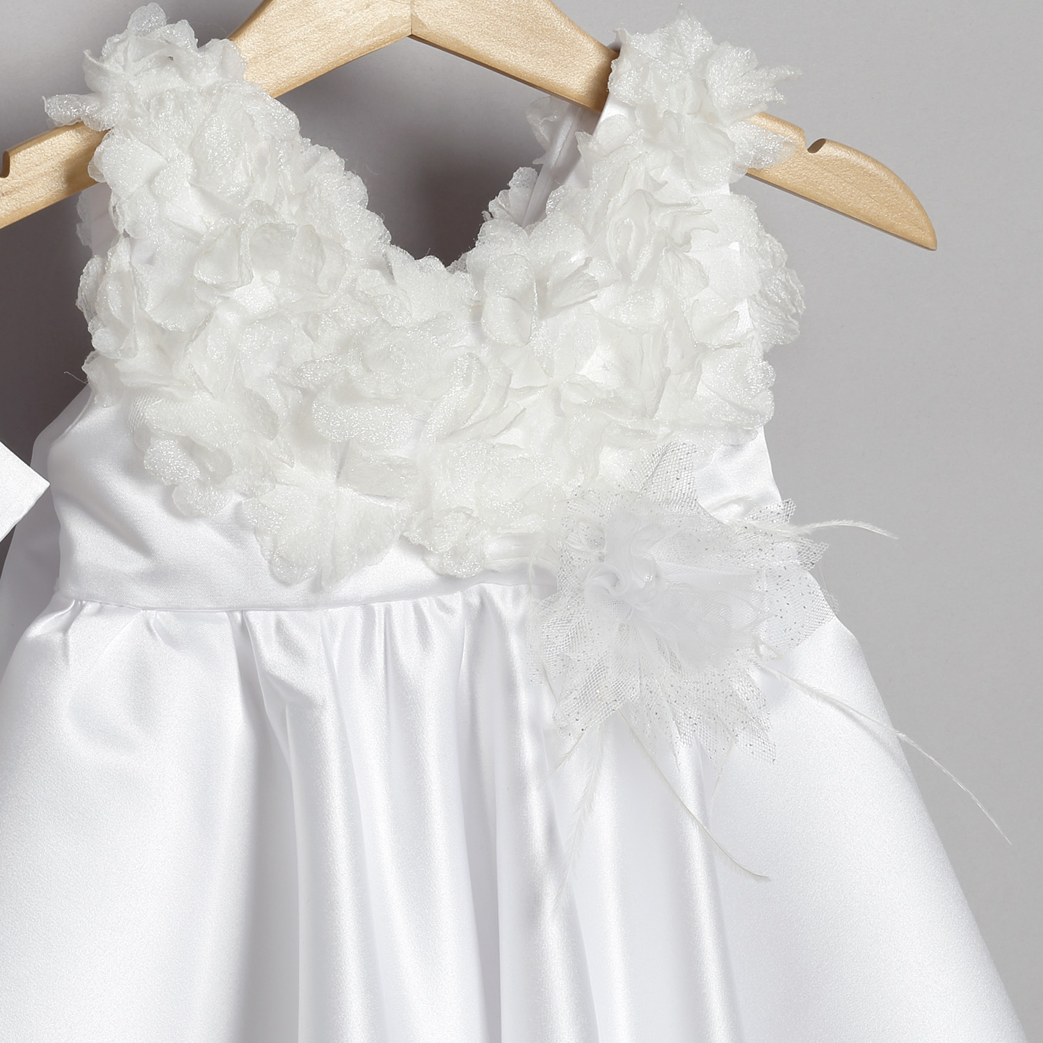 Φόρεμα από σατέν σε άσπρο χρώμα. Στο εσωτερικό του φορέματος υπάρχει βαμβακερή φόδρα. Ο στολισμός αποτελείται από μια σειρά από λουλούδια ραμμένα στην επιφάνεια του μπούστου. Στη μέση υπάρχει ένα λουλούδι από τούλι και πούπουλα. Στο πίσω μέρος υπάρχει ένας σατέν φιόγκος. Το φόρεμα διατίθεται επίσης σε εκρού, μπεζ, ροζ, σωμόν και σάπιο μήλο χρώμα. Ζακετάκι από σατέν σε άσπρο χρώμα, επενδυμένο με βαμβακερή φόδρα, με ένα κουμπί πέρλα που χρησιμοποιείται για το κλείσιμο. Διατίθεται επίσης σε εκρού, μπεζ, ροζ, σωμόν και σάπιο μήλο χρώμα. Κορδέλα από άσπρο σατέν στολισμένη με σειρά από λουλούδια.
