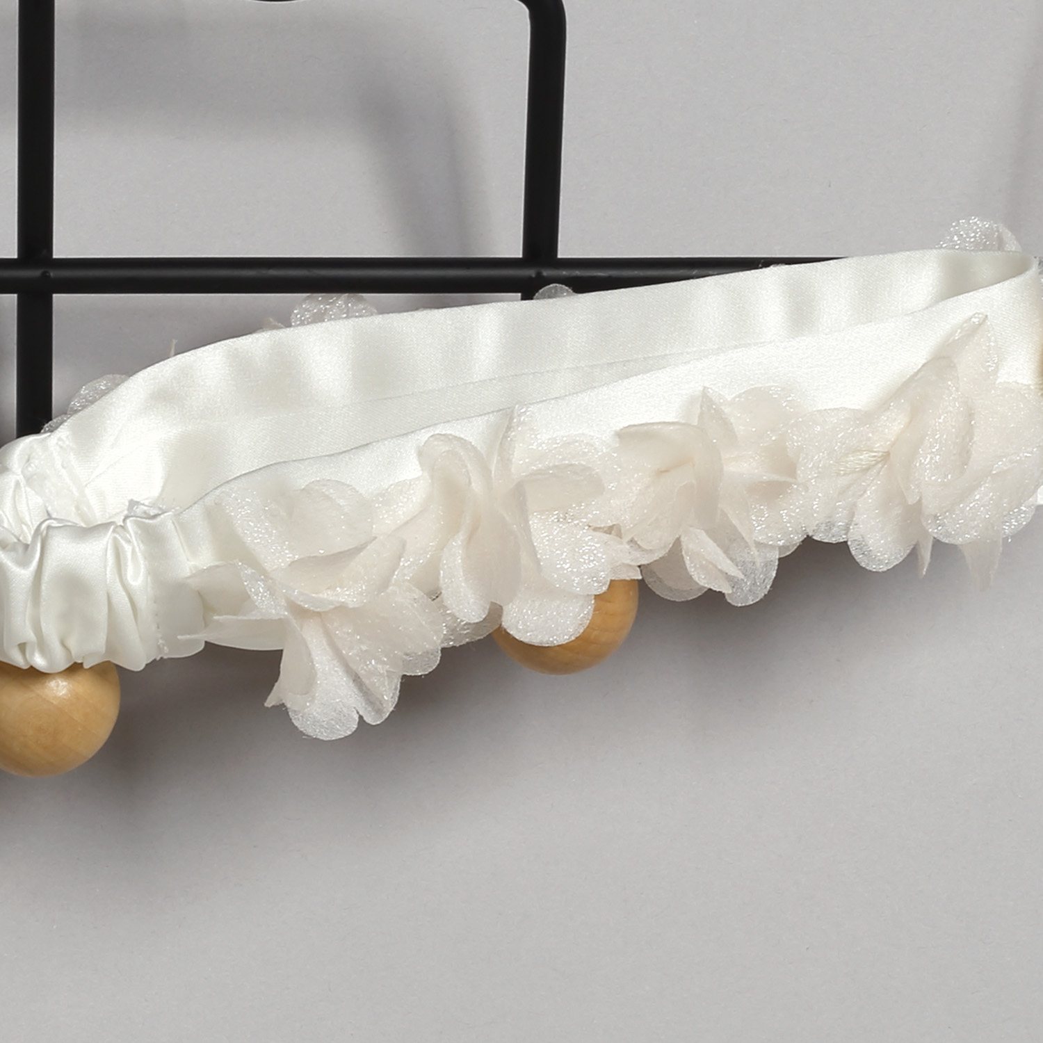 Φόρεμα από σατέν σε εκρού χρώμα. Στο εσωτερικό του φορέματος υπάρχει βαμβακερή φόδρα. Ο στολισμός αποτελείται από μια σειρά από λουλούδια ραμμένα στην επιφάνεια του μπούστου. Στη μέση υπάρχει ένα λουλούδι από τούλι και πούπουλα. Στο πίσω μέρος υπάρχει ένας σατέν φιόγκος. Το φόρεμα διατίθεται επίσης σε άσπρο, μπεζ, ροζ, σωμόν και σάπιο μήλο χρώμα. Ζακετάκι από σατέν σε εκρού χρώμα, επενδυμένο με βαμβακερή φόδρα, με ένα κουμπί πέρλα που χρησιμοποιείται για το κλείσιμο. Διατίθεται επίσης σε άσπρο, μπεζ, ροζ, σωμόν και σάπιο μήλο χρώμα. Κορδέλα από εκρού σατέν στολισμένη με σειρά από λουλούδια.