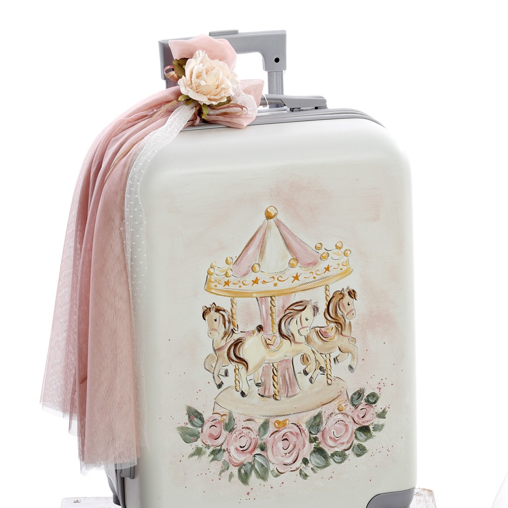 ✔ Βαλίτσα τροχήλατη ζωγραφισμένη στο χέρι, με εντυπωσιακή παράσταση καρουζέλ, ρομαντικά τριαντάφυλλα και χρυσές λεπτομέρειες. Στολισμένη με τούλια, φιόγκους και λουλούδια. (Διαστάσεις: 57cm x 40cm x 22cm)