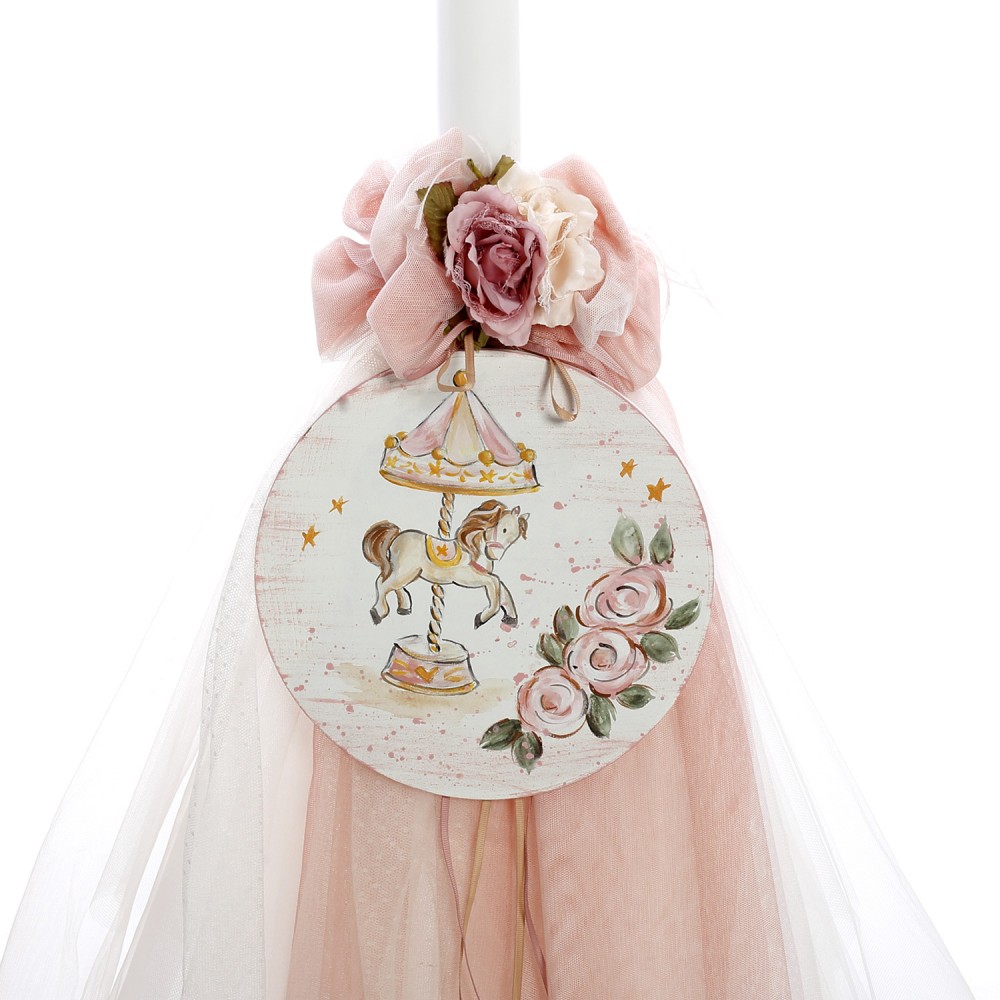 ✔ Λαμπάδα βάπτισης, διακοσμημένη με ξύλινο στοιχείο καρουζέλ, αέρινα τούλια, ρομαντικά λουλούδια και κορδέλες.
