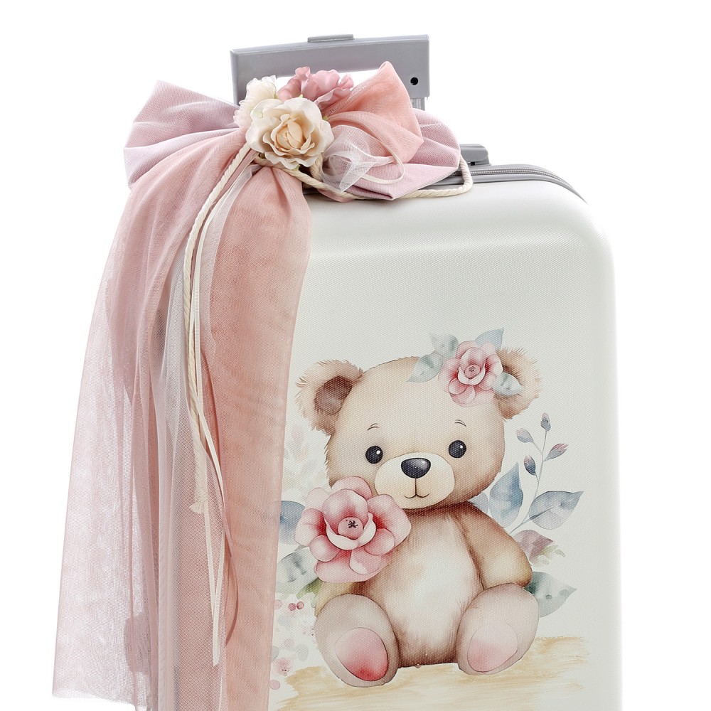 ✔ Βαλίτσα τροχήλατη ζωγραφισμένη στο χέρι, με πανέμορφα τριαντάφυλλα, πεταλούδες και χρυσό plexiglass μονόγραμμα. Στολισμένη με τούλια, κορδέλες και υφασμάτινα λουλούδια. (Διαστάσεις: 57cm x 40cm x 22cm)