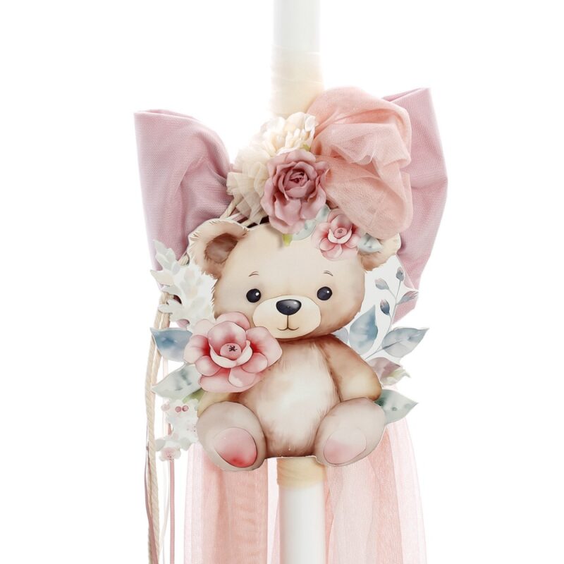 ✔ Λαμπάδα βάπτισης, διακοσμημένη με ξύλινο στοιχείο UV εκτύπωσης λουλουδιών, πολυτελείς φιόγκους, τούλι και χρυσό μονόγραμμα.