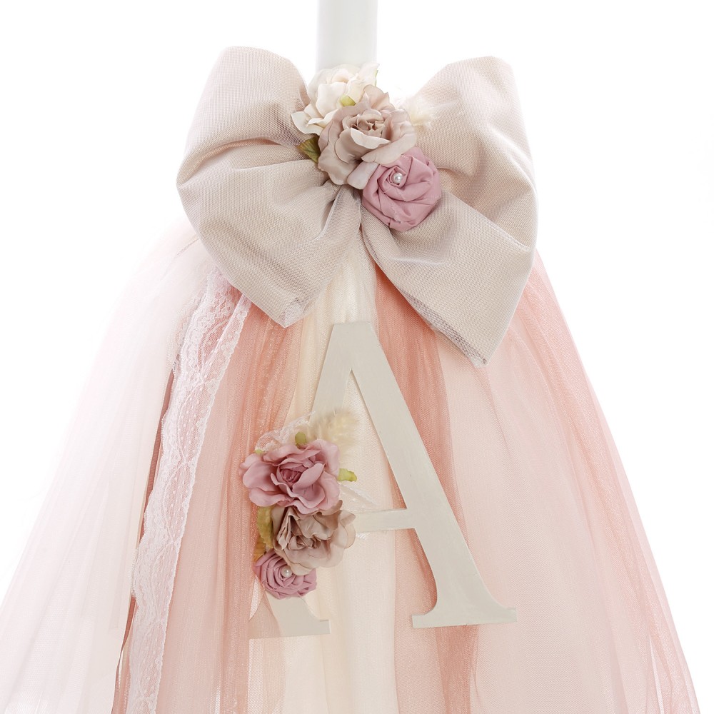✔ Λαμπάδα βάπτισης, διακοσμημένη με ανάγλυφο μονόγραμμα, πολυτελείς φιόγκους, υφασμάτινα λουλούδια και αέρινα τούλια.