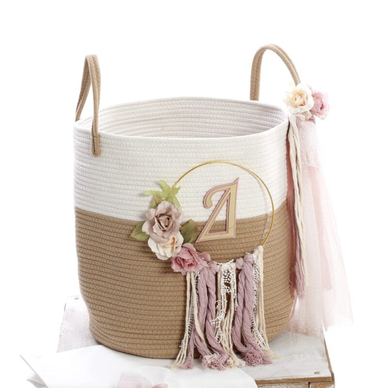 ✔ Πλεκτό καλάθι βάπτισης διακοσμημένο με μεταλλικό στεφάνι, μονόγραμμα plexiglass και διακοσμητικές μακραμέ φούντες. (Διαστάσεις: 50cm x 40cm x 40cm)
