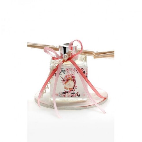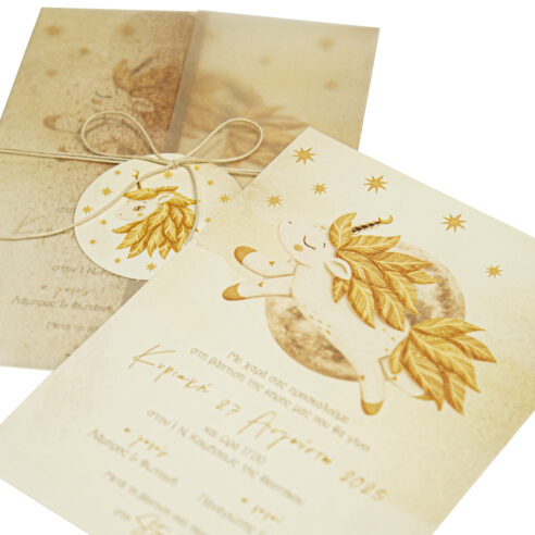 Σετ βάπτισης της εταιρίας Bellissimo με θέμα Μονόκερο, στους χρωματικούς συνδυασμούς του μπεζ και του σάπιου μήλου.