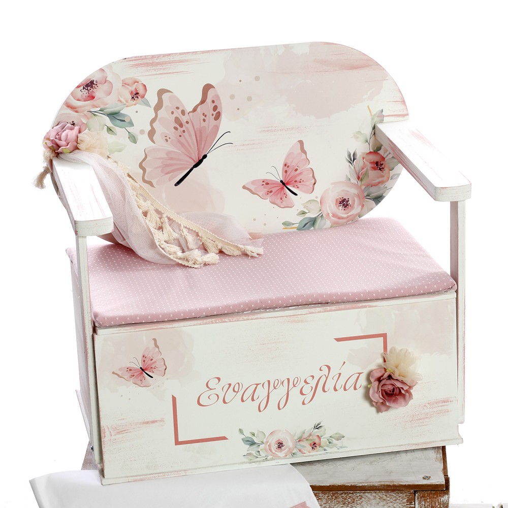 ✔ Ξύλινο παγκάκι-κουτί με UV εκτύπωση πεταλούδων και λουλουδιών, ιδανικό για αποθήκευση. (Διαστάσεις: 50cm x 52cm x 30cm)