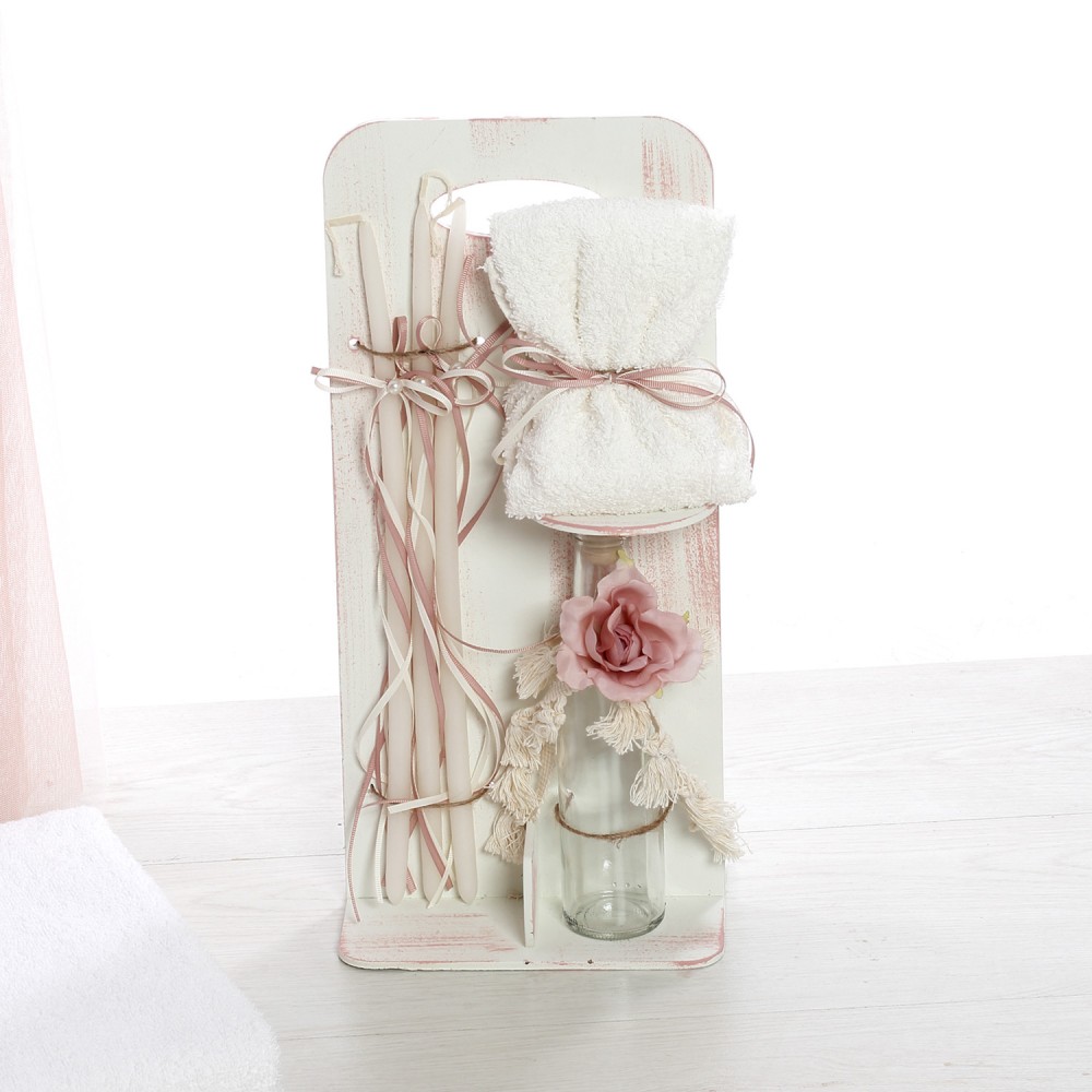 ✔ Σετ λαδιού με μπουκαλάκι, σαπούνι και κεράκια, διακοσμημένα με υφασμάτινα λουλούδια και κορδέλες.